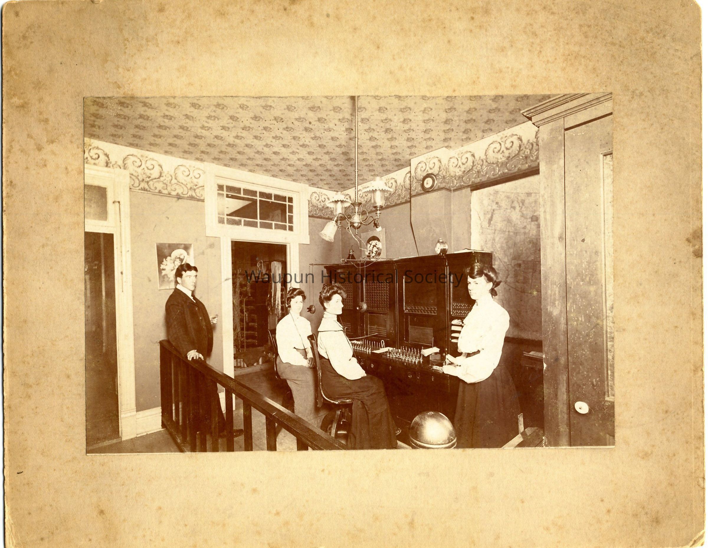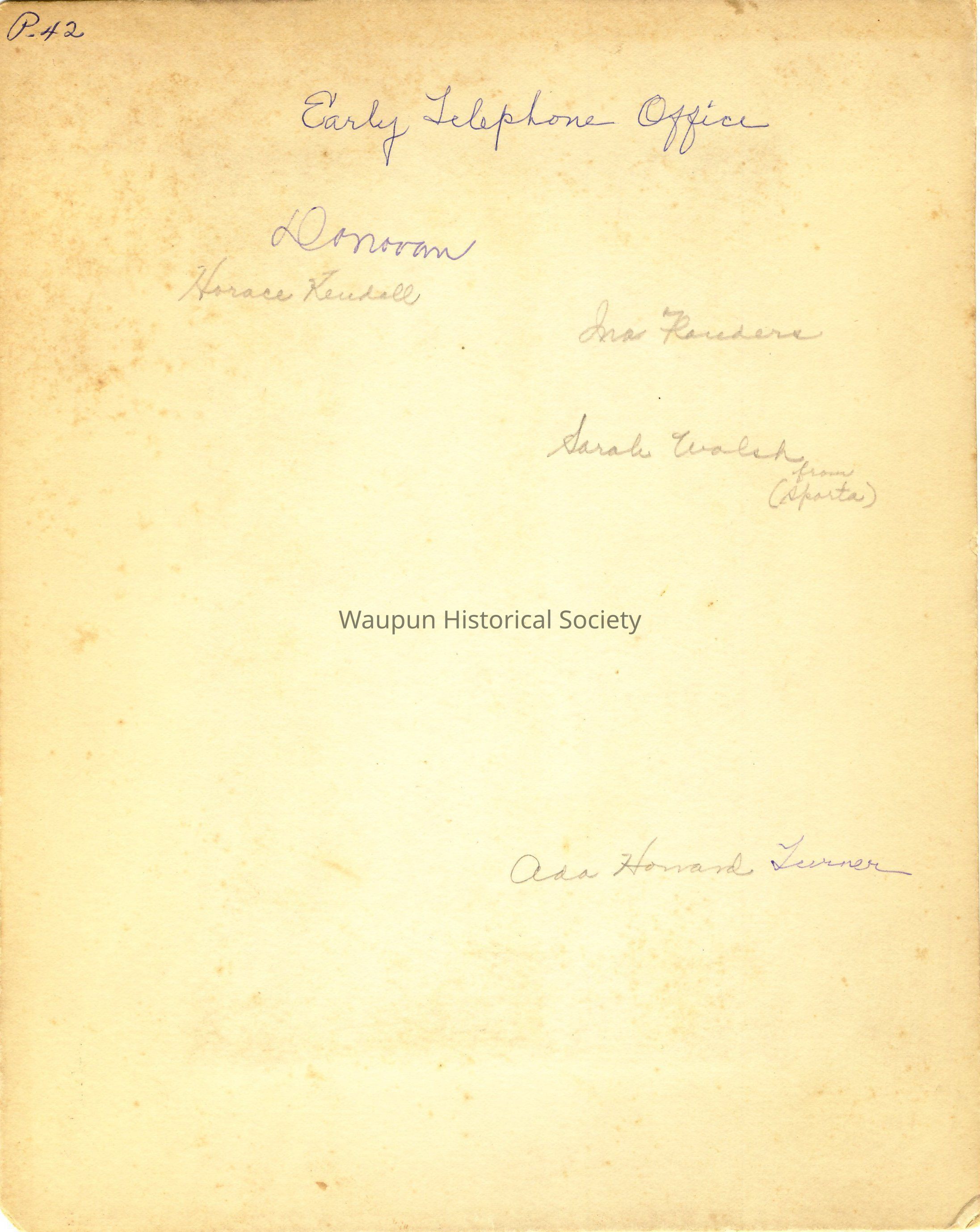 Black and white photo glued on a hard cardboard backing of the early Telephone Office of Waupun. Believed to have been donated by a Donovan. The names on the back of the photo are: Horace Kendall, Ina Flanders(?), Sarah Walsh from Sparta, and Ada Howard Turner.