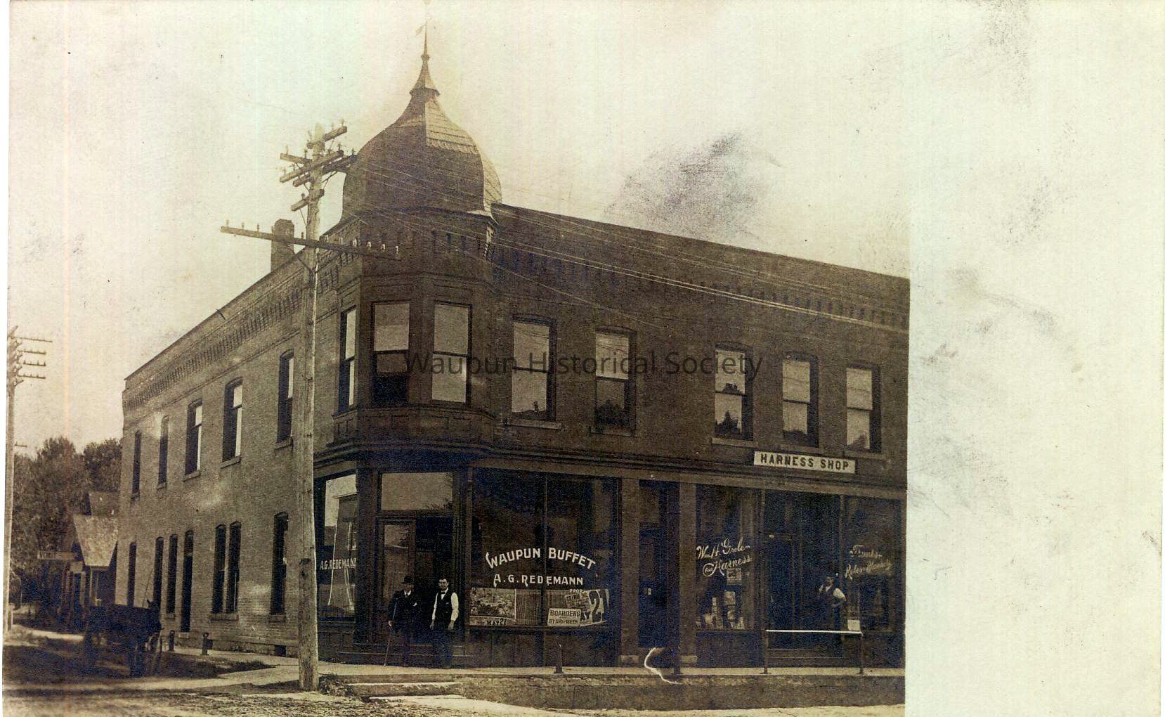 Waupun Buffet. This undated picture postcard shows two men in front of the Waupun Buffet,. The sign in the window says A. G. Redemann. Located on the southwest corner of Main & Carrington.Acquisition