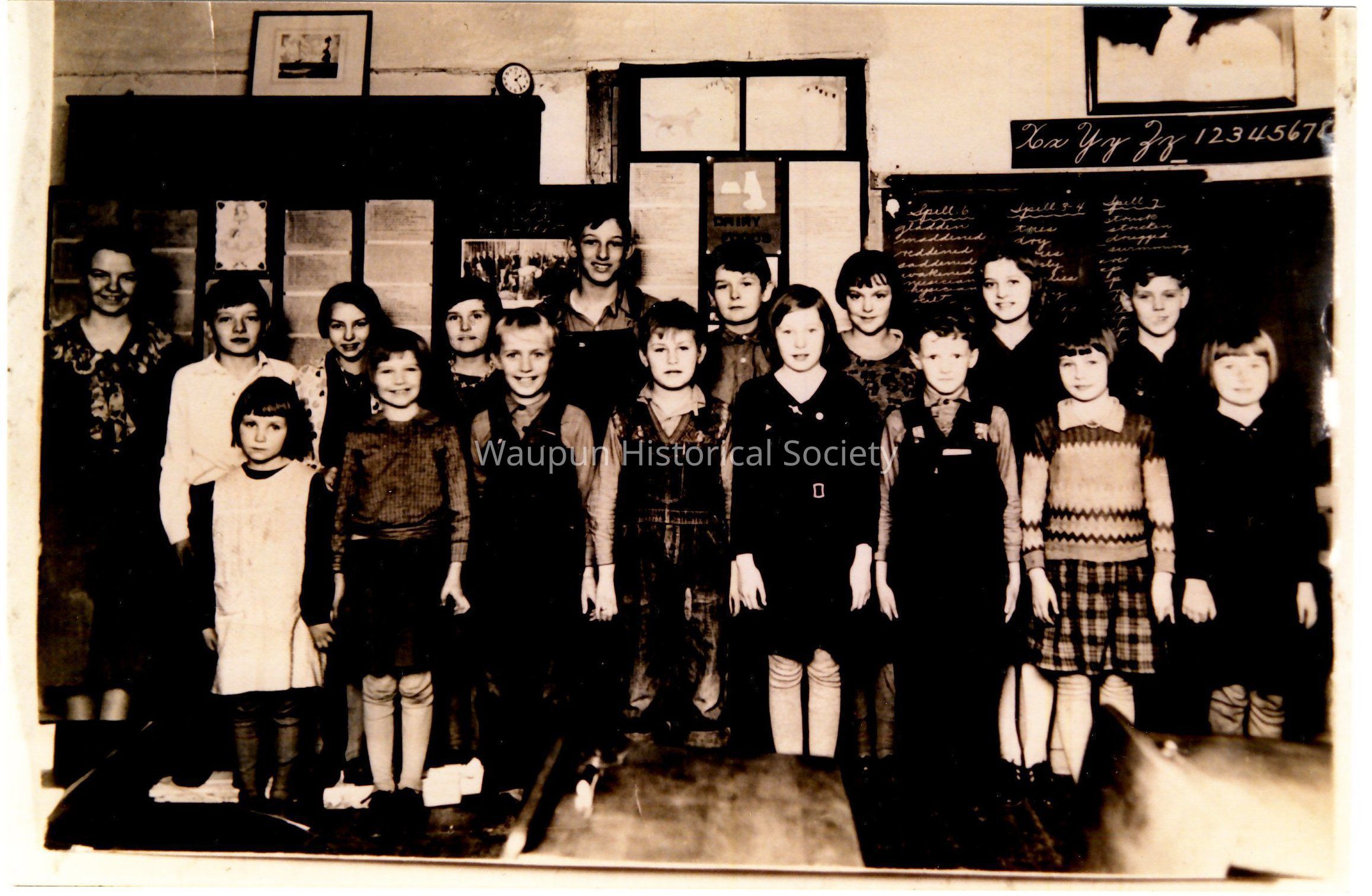 Photo of students and teacher from Sleepy Hollow School, ca. 1931-1934, on Hwy 26, Dodge Co., Wisconsin. The name of the school, later, was Oak View. Names of teacher and students are,