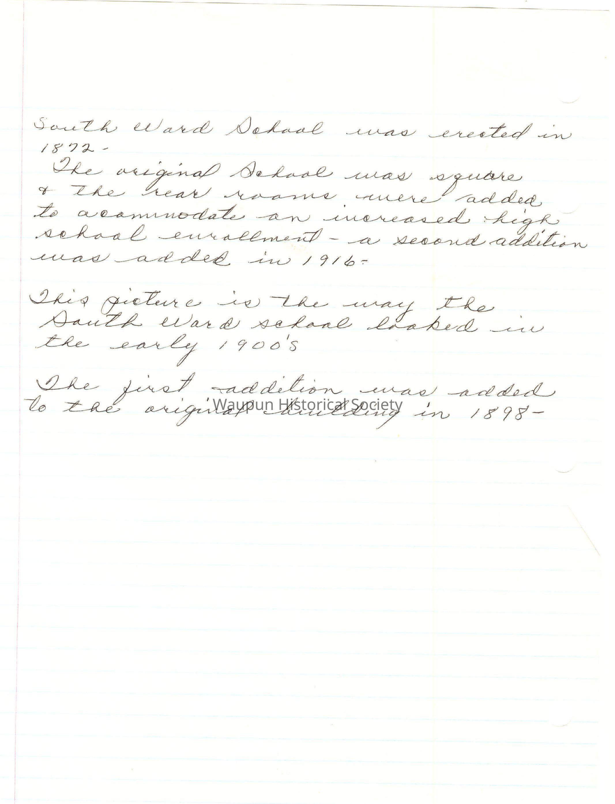 The South Ward School was erected in 1872. The original school was square and the rear rooms were added to acommodate an increased high school enrollment - a second addition was added in 1916.