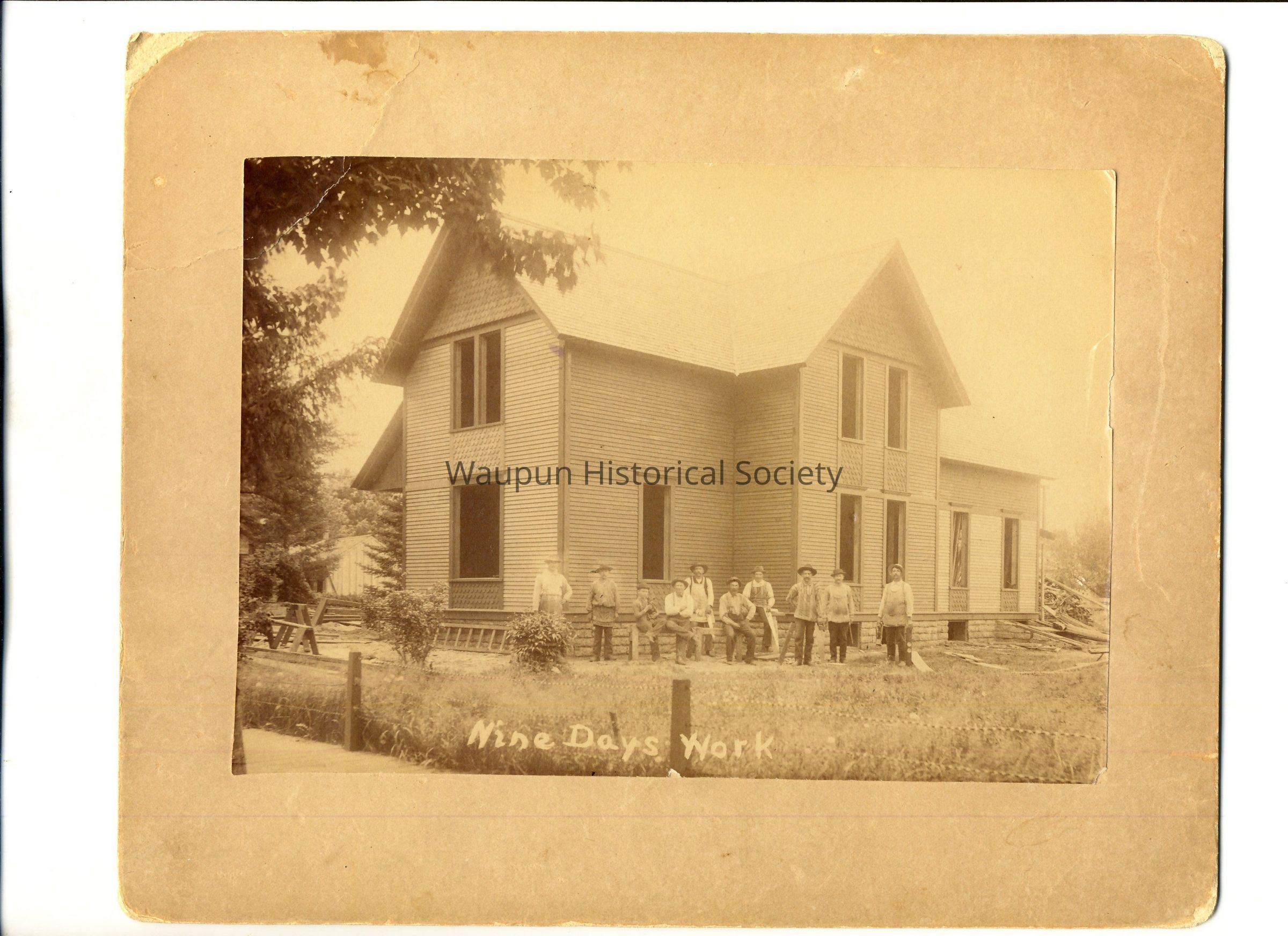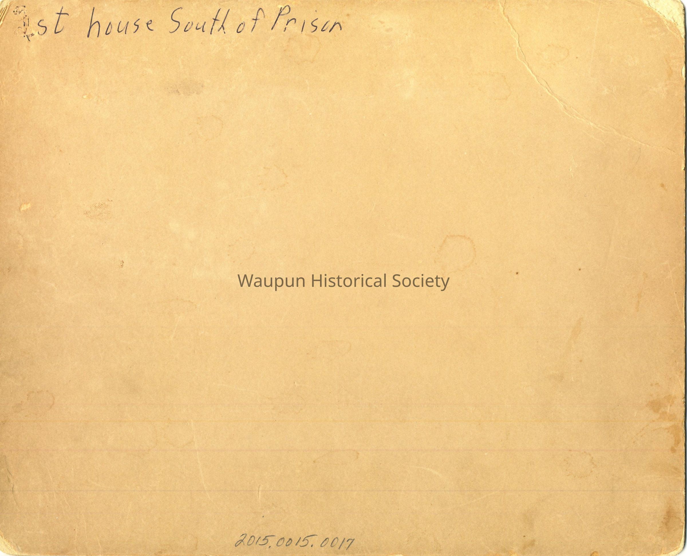 Photo of 1st house south of prison is written on back of photo. Also "Nine Days Work" handwritten on front of photo. No date or names of individuals on photo.