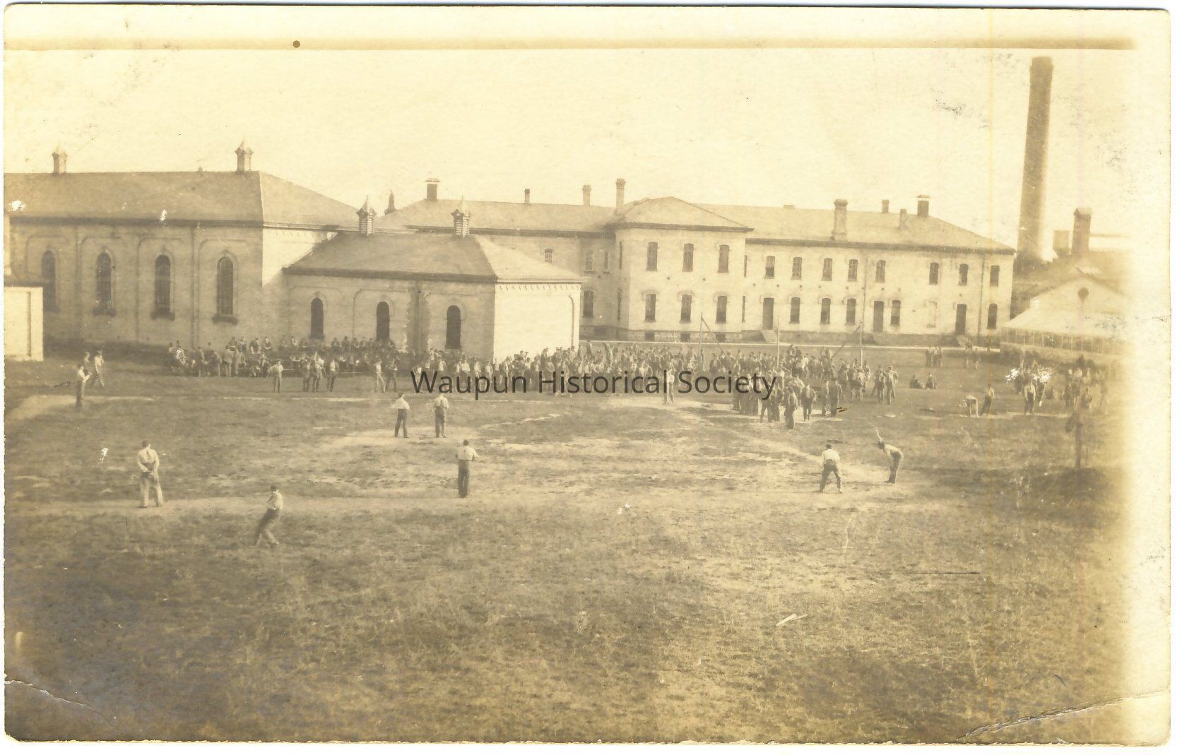 Postcard, Corrections, Wisconsin State Prison, Ball Field. Postcard with photo of State Prison, Waupun, WI. The picture on the front appears to be of the prison baseball team playing baseball and other inmates watching in the prison yard. Jim Laird purchased on eBay and is in a hard plastic protector.Acquisition