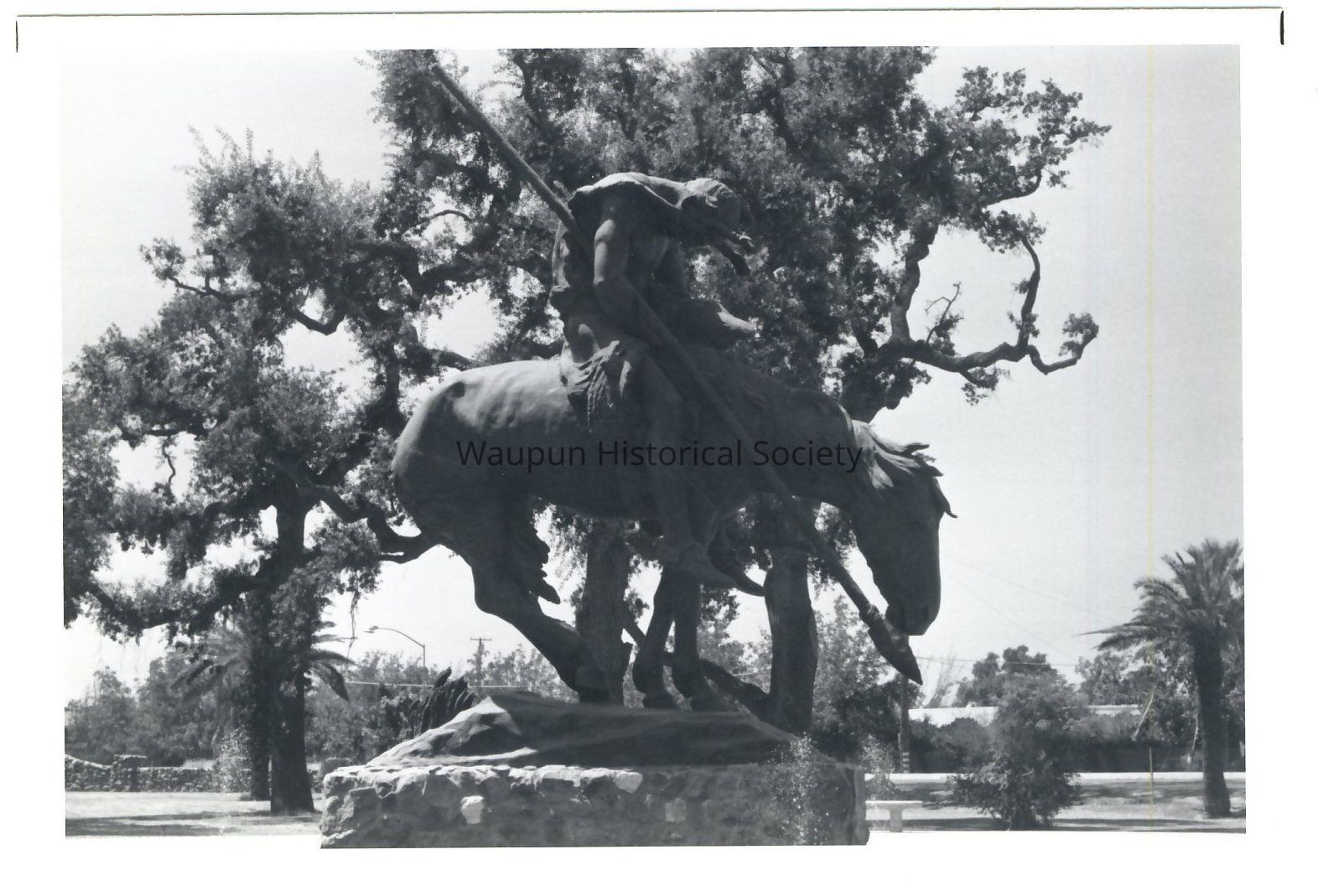 Black and white photo of The End of The Trail statue when in Calif. before it was moved to the Cowboy Hall of Fame in Oklahoma City and then to Waupun, WI.
