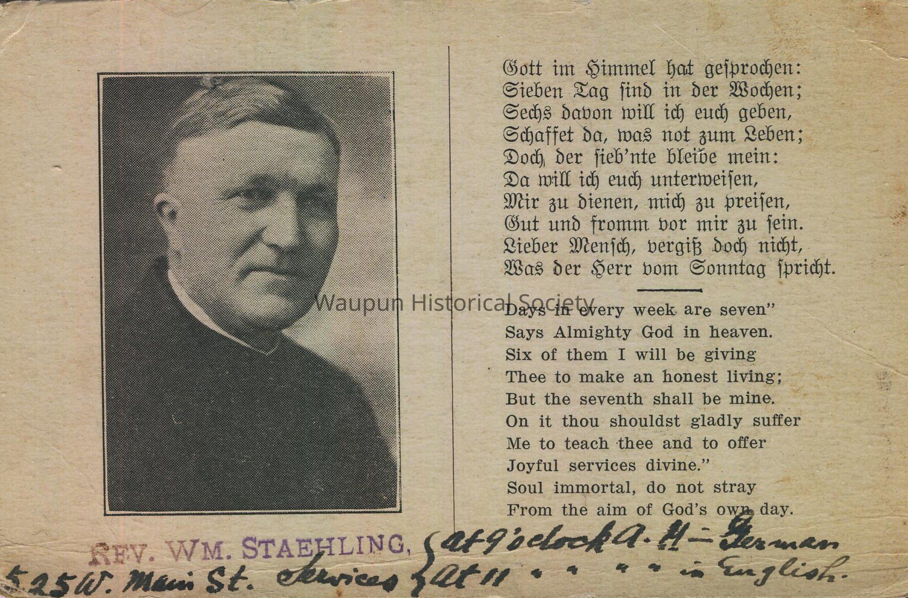 Card, Church, Immanuel Lutheran, Rev. William Staehling. Waupun Churches. This black & White picture postcard shows the Lutheran Church of Waupun, Wis. It was donated by Jim Laird from his personal collection. This is an unused postcard. On the reverse of this card it shows a picture of Rev. William Staehling, and handwritten it says: "525 W. Main St. services at 9 O' Clock a.m. in German, at 11 '" " " " " in English.Acquisition