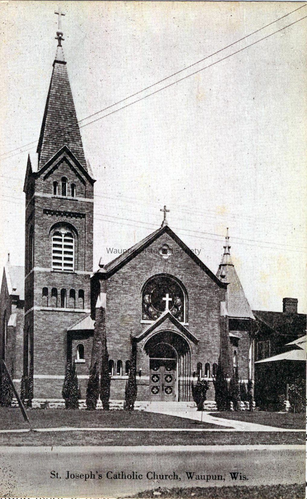Postcard, Church, St. Joseph Catholic. Waupun Churches. This Black & White picture postcard shows the St. Joseph's Catholic Church of Waupun, Wis. It was donated by Jim Laird from his personal collection. This is an unused postcard.Acquisition