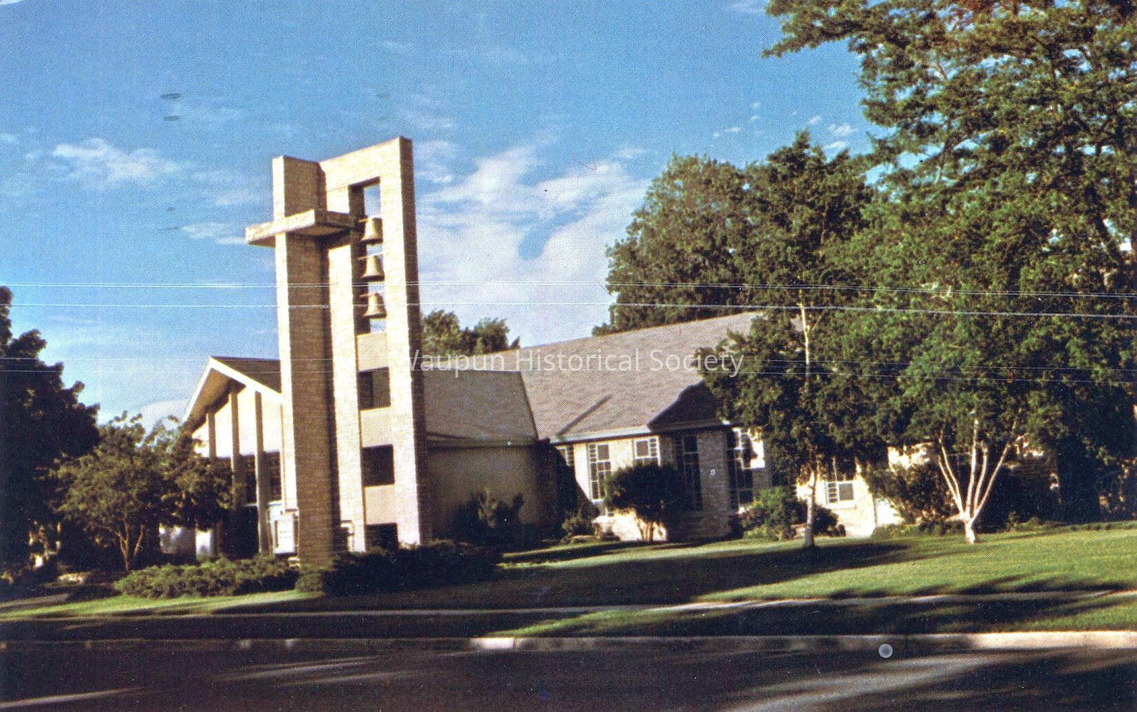 Postcard, Church, Union-Congregational, UCC. Waupun Churches. This scan of a color picture postcard comes from Jim Laird's personal collection. On the back is printed: "The UNION-CONGREGATIONAL CHURCH of Waupun, Wisconsin affiliated with the United Church of Christ, is the union of for of Waupun's oldest Christian congregations- Congregation, Baptist, Disciples and Free Will Baptist. The sanctuary was dedicated in 1959 and the educational wing in 1972.Acquisition