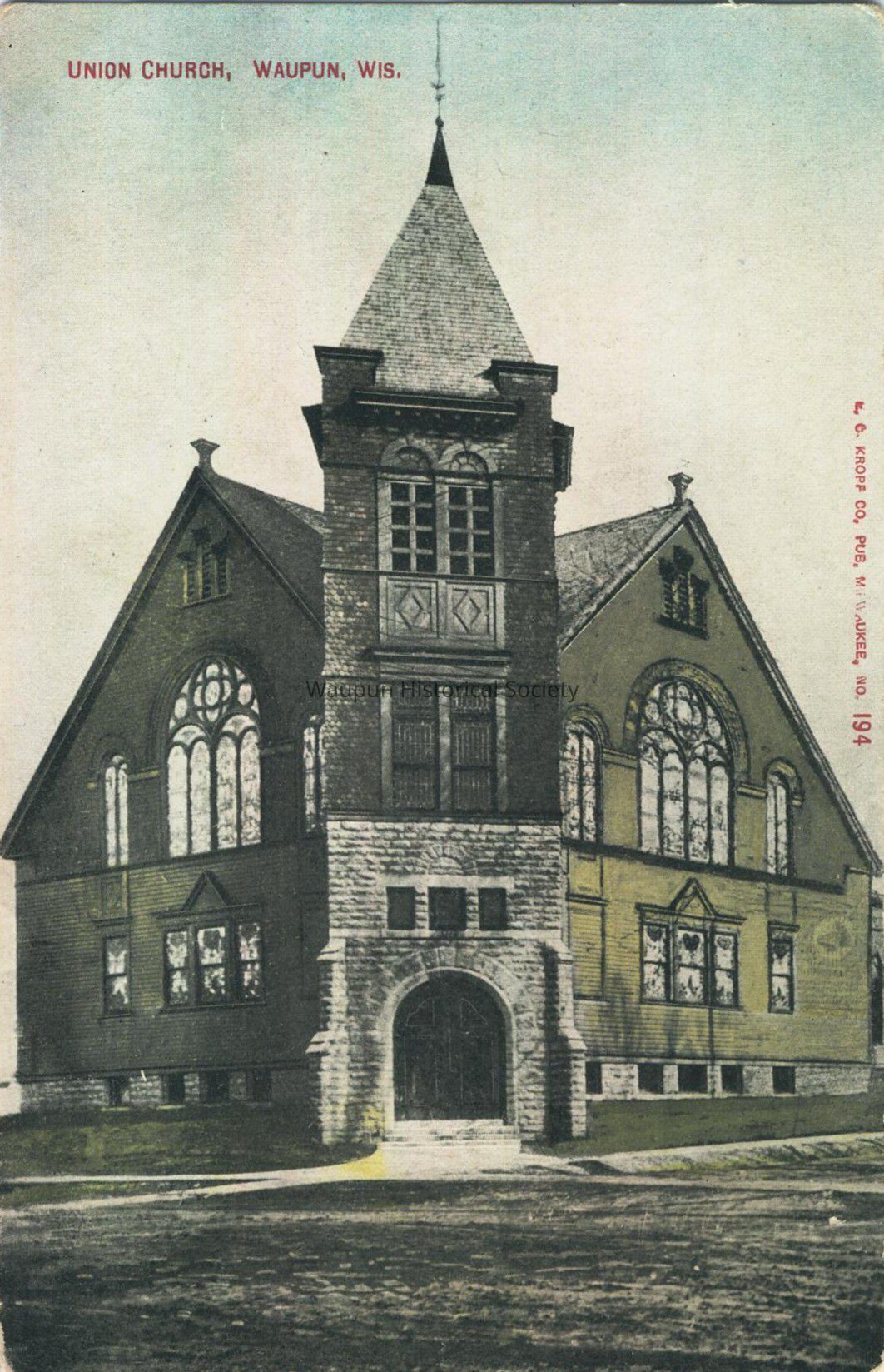 Postcard, Church, Union, Waupun Churches. This colorized picture postcard shows the Union Church of Waupun, Wis. It was donated by Jim Laird from his personal collection. The card is unused.