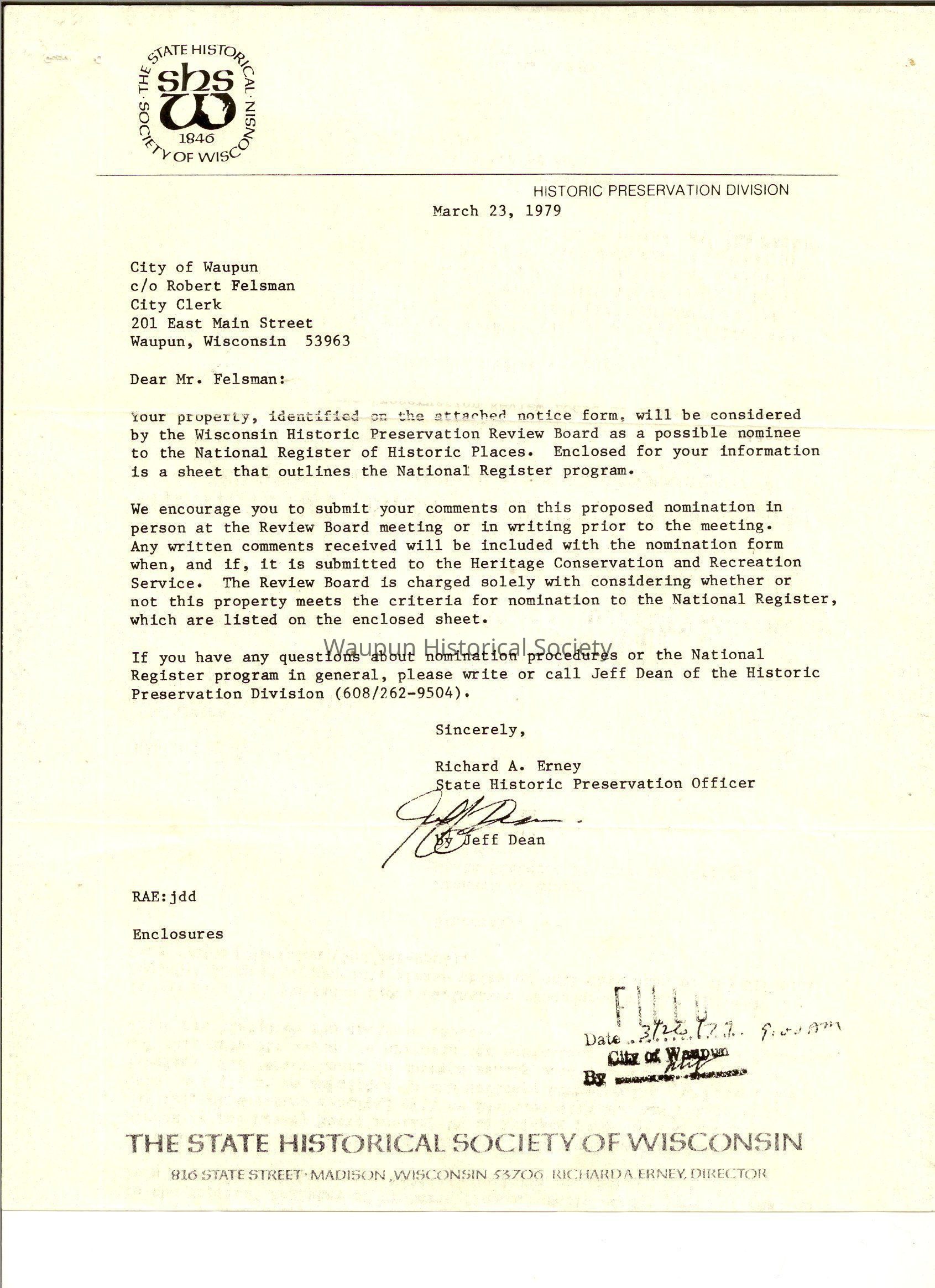 A Document of Waupun Historic Preservation Division your Property identified on the attached notice form will be considered by Wisconsin Historic Preservation review board as a possible nominee to the national Register of Historic Places.Acquisition