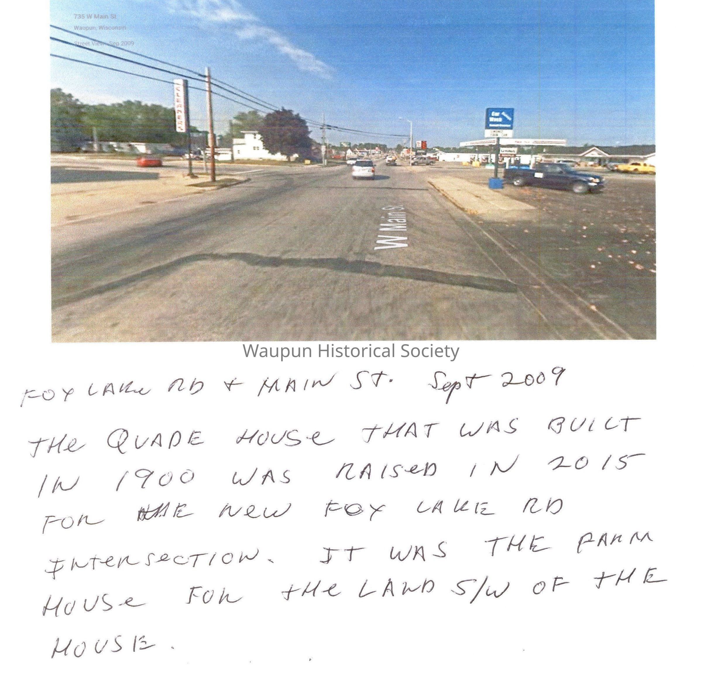 Computer copy of photo of Bishop's Car Wash of September 2009 showing Fox Lake Rd. & Main St. intersection. The Quade House that was built in 1900 was raised in 2015 for the new Fox Lake Rd. intersection. It was the farm house for the land south west of the house.