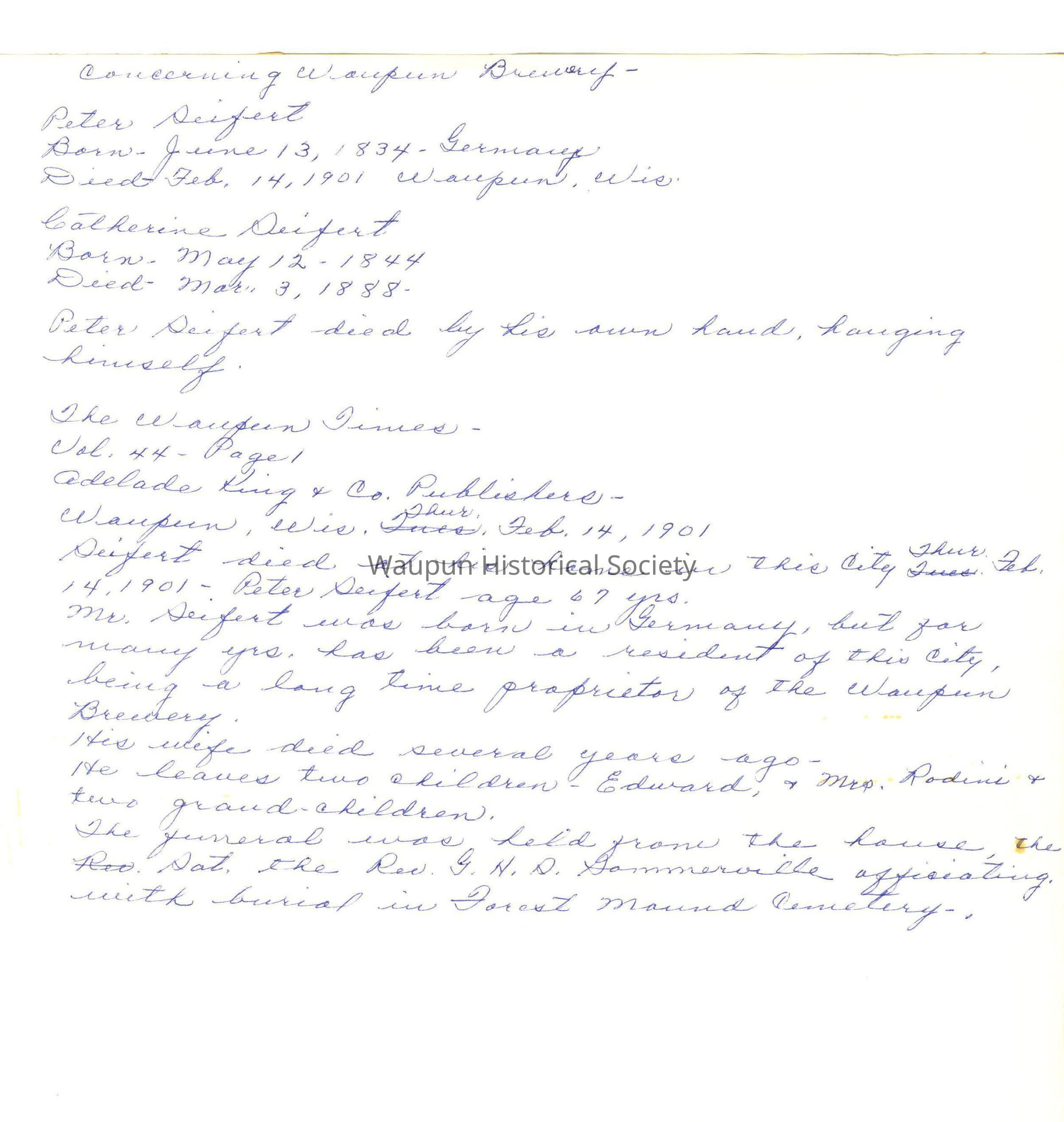 Mr. Seifert was born in Germany, but for many years has been a resident of this city, being a long time proprietor of the Waupun Brewery.