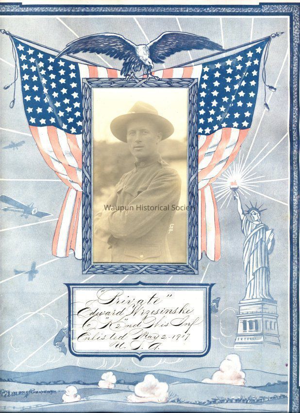 Enlistment photo postcard of Private Edward Wrzesinske which is taped and framed in a paper frame, red, white and blue in color. An eagle is between two American flags and the print of the statue of liberty and planes is on background of paper frame. The information - "Private" Edward Wrzesinske, Co "K" 2nd Wis Inf, Enlisted May 2, 1917, U. S. A. is hand printed in a boxed frame on paper frame, under the photo.