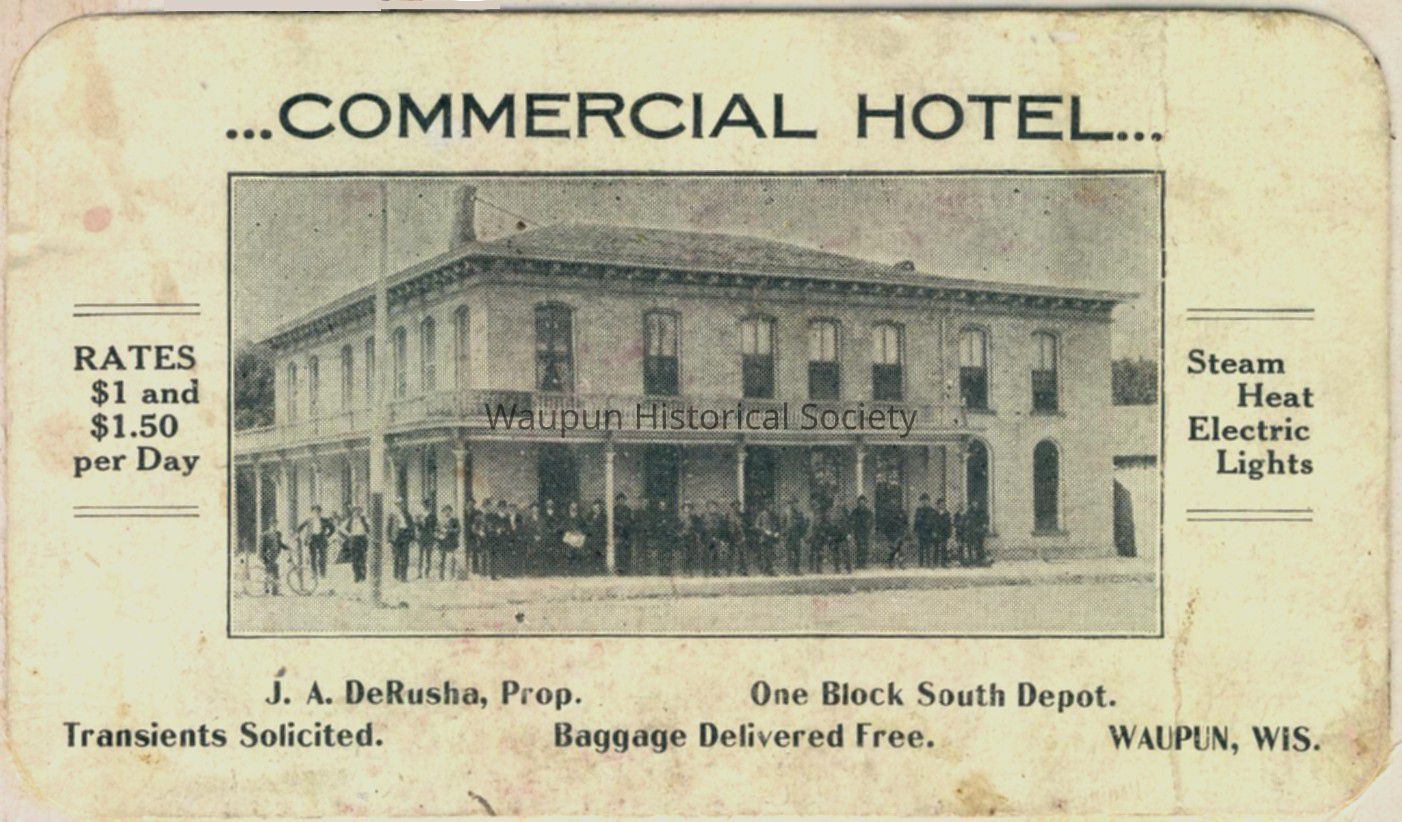 Early Waupun Hotels: This baggage tag was an advertising tool for the Commercial Hotel. Looking at the card you can see the room rates of $1 or $1.50 per day. This tag is undated, however, the proprietor of the hotel was J. A. DeRusha. In 1910 the proprietor of the hotel was Joseph Collins.Acquisition