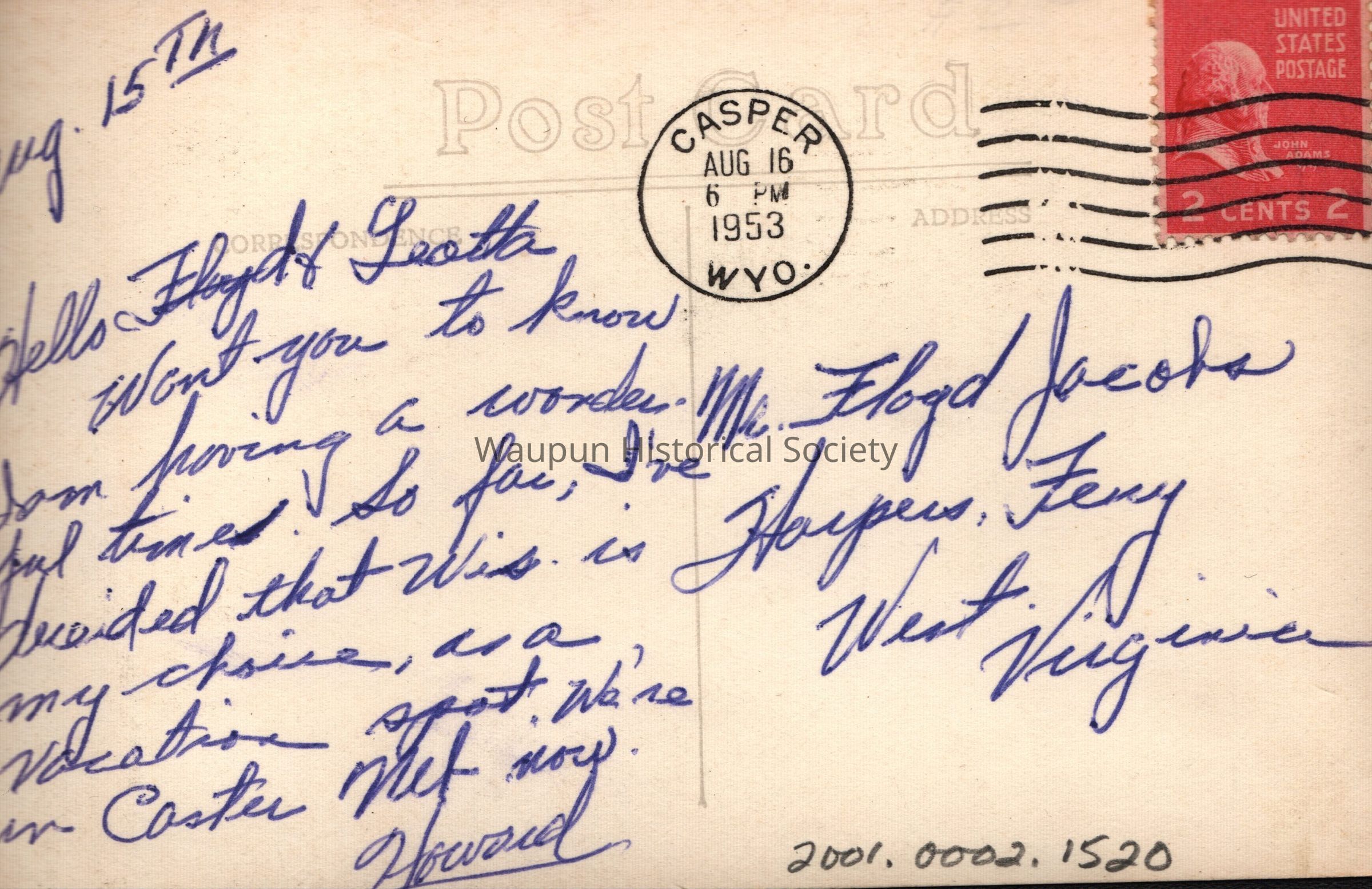 Postcard, Parks, Fond du Lac County Park, #16. The Fond du Lac County Park is located at the North West end of Waupun. The park for many years was virgin woods. It contained a band shell and a WPA Project stone work along the river. This card is postmarked Aug. 16, 1953Acquisition