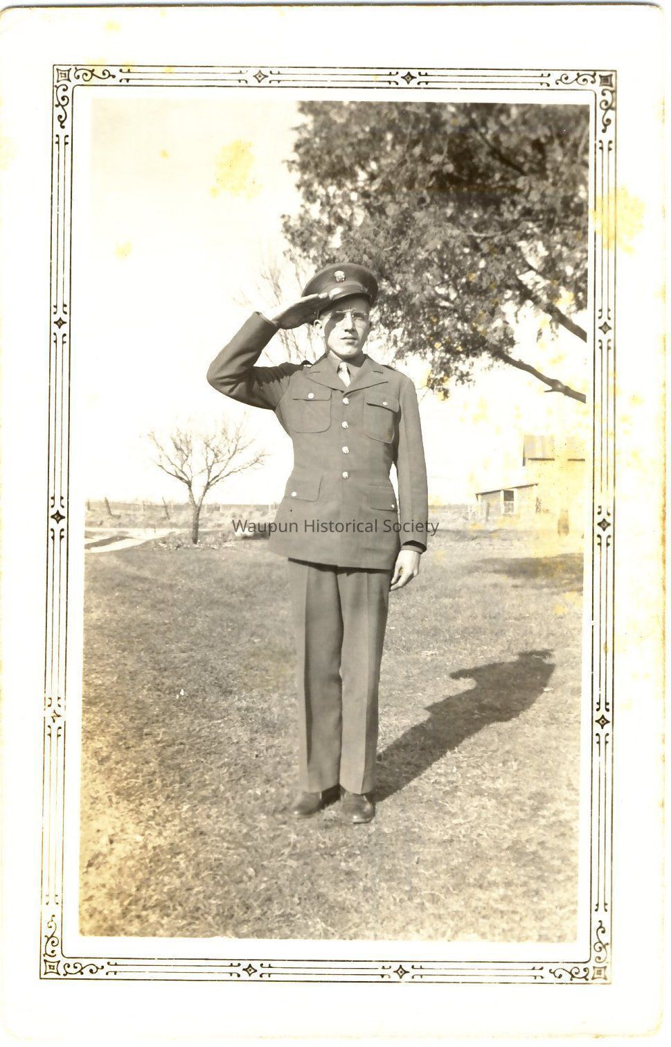 Military photo of Wilton A. Zick during WWII era in full uniform. He appears to be standing at attention because he is saluting. Possibly when he left for service as he is standing on grass on someone's homestead.Acquisition