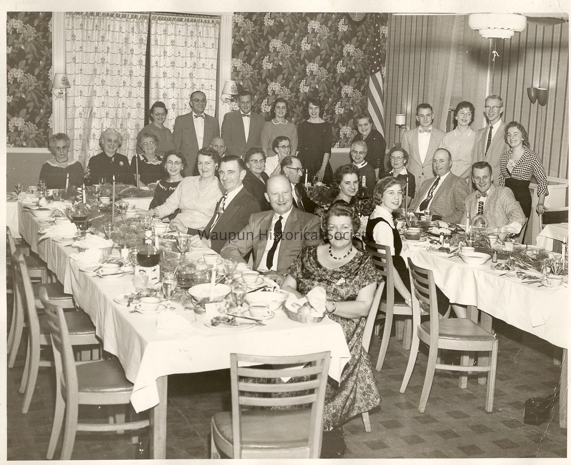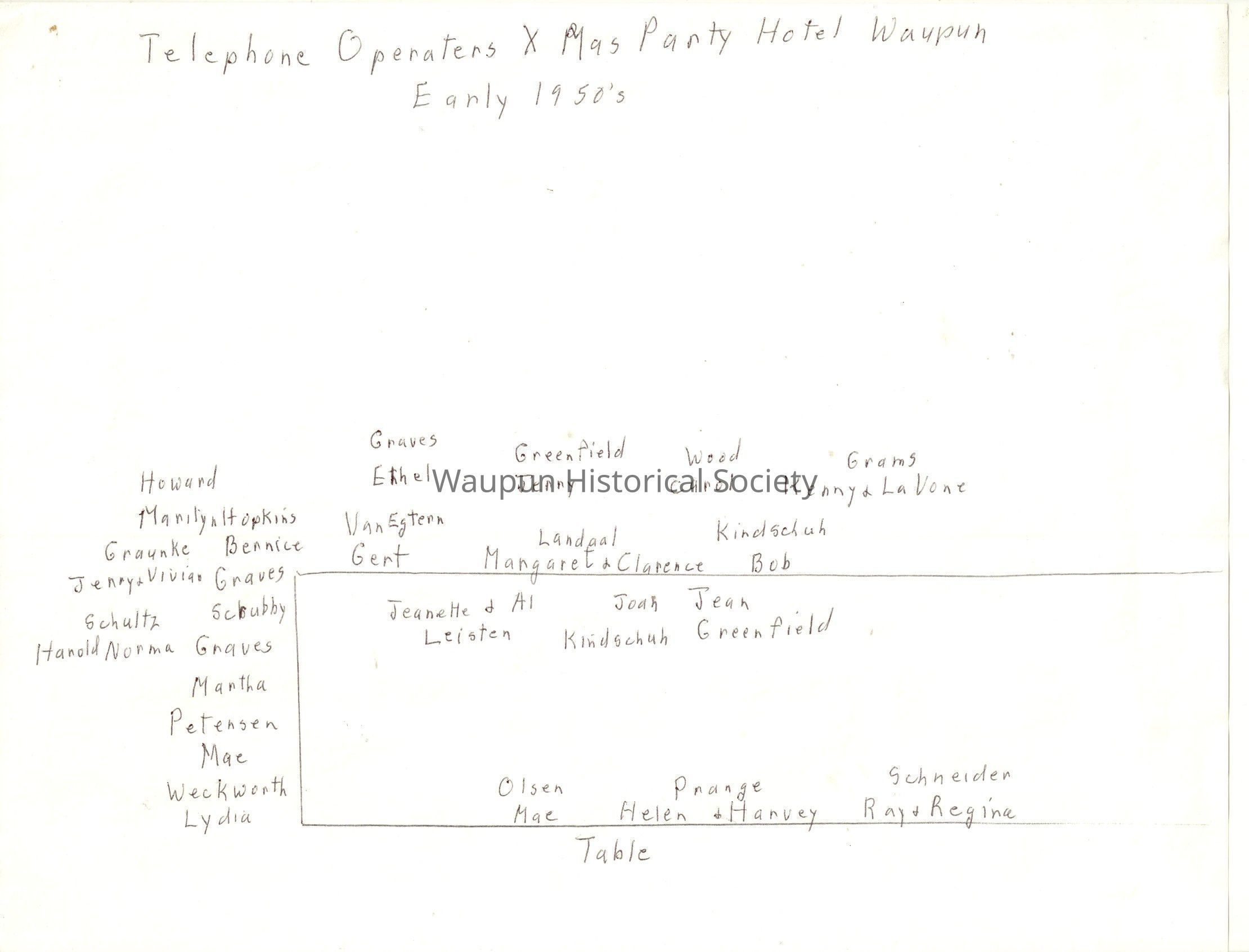 8x10 black and white photo of the Waupun Telephone Company operator's Christmas party. The back of the picture shows the photo taken by (Ervin Fletcher) Fletcher Studio of Waupun. An additional sheet of white paper includes the names of those in the photo and that it was taken at the Hotel Waupun in the early 1950's.Acquisition