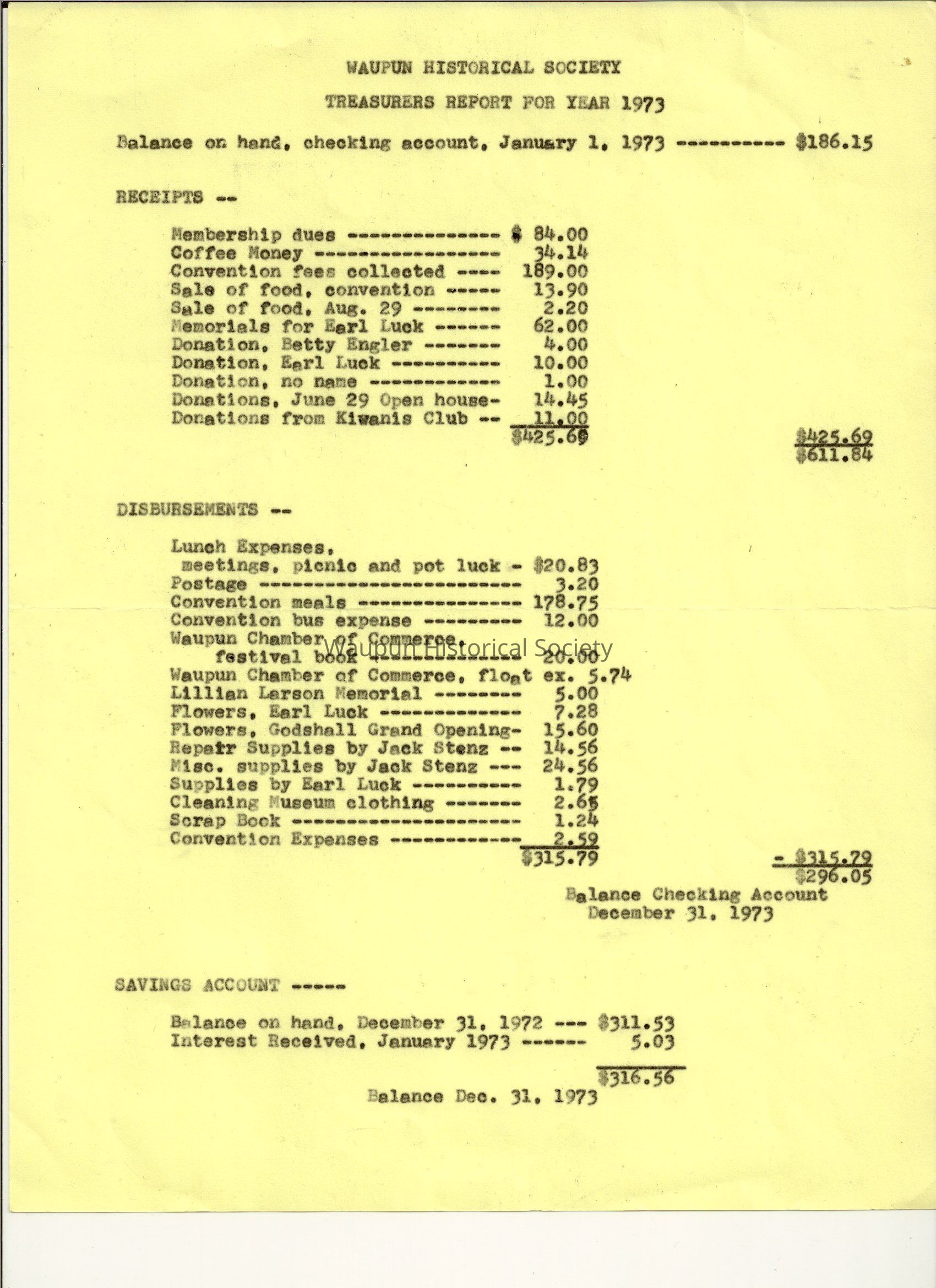 A Document of Waupun Historical Society Treasurers Report for the year of 1973 and the disbursements and receipts and the balance.Acquisition
