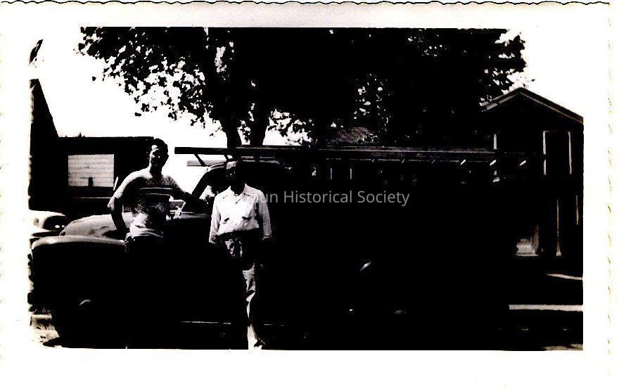 Black and white photo showing the Ganz Electric Service, Tel. 466W.,Waupun, Wis. ad on a truck with two men standing next to it. No names are indicated, but could possibly be Wm. Ganz and son, Douglas Ganz.Acquisition