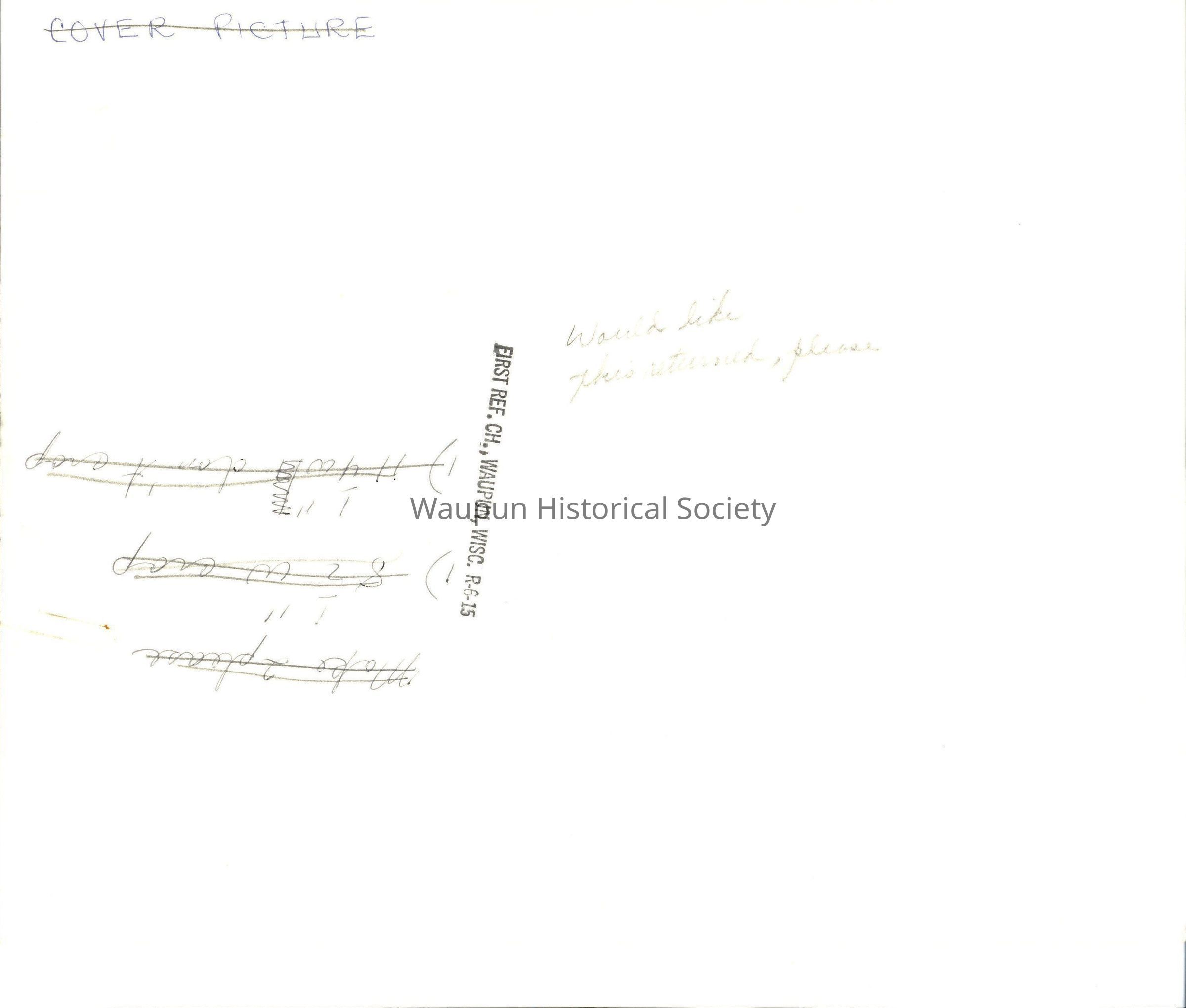 Black and white photo of the First Reformed Church of Waupun. This was included with paperwork compiled for historical info for the Waupun 1976 Bicentennial Celebration.Acquisition