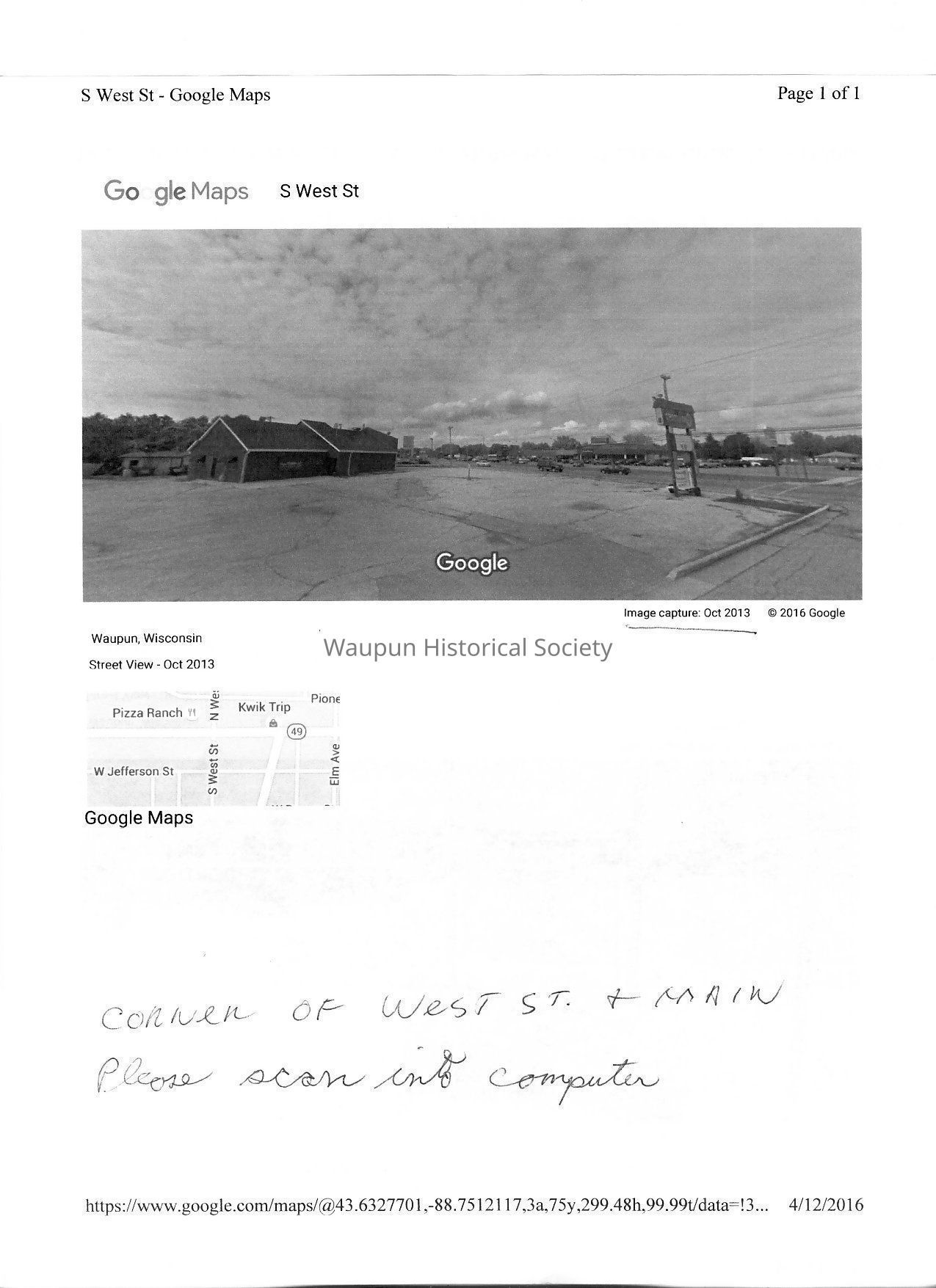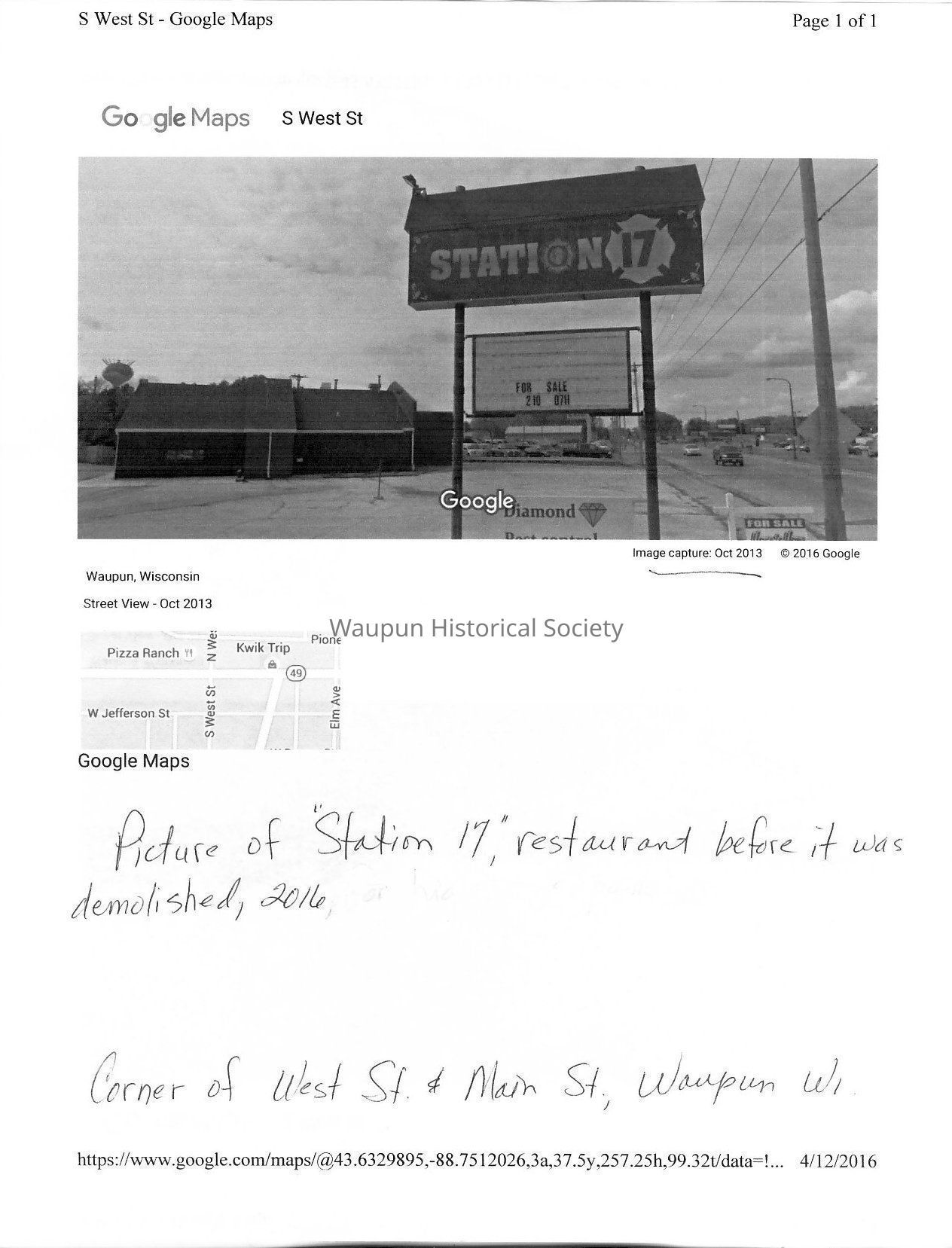 Google Map photo of "Station 17" restaurant located at corner of West St. and Main St., Waupun, WI before it was demolished April 2016.