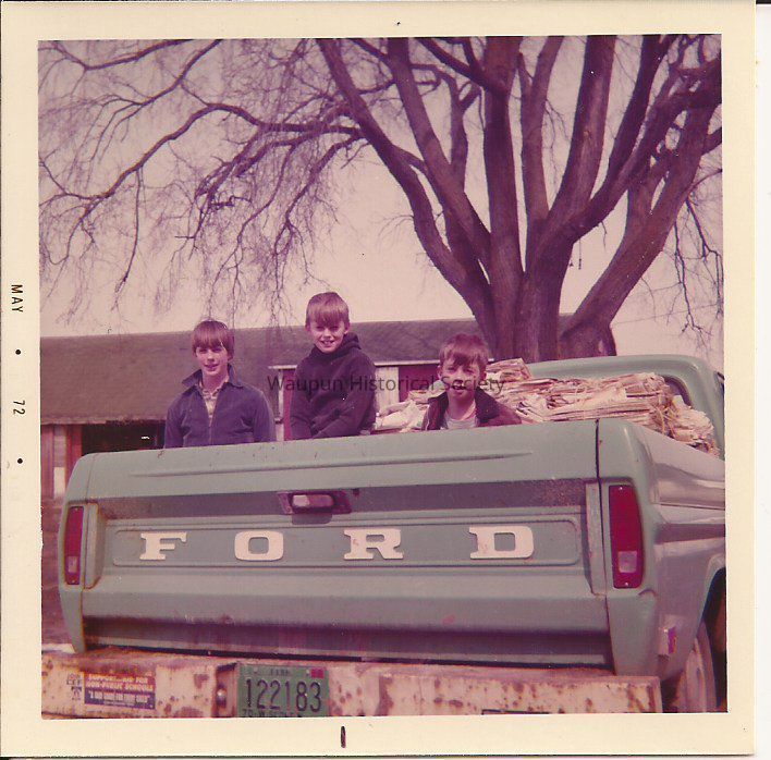 Color photo of Weeping Willow Club, Paper Drive. A date of May 1972 is on border of photo. No names indicated for 3 young boys in back of Ford truck. The back of the photo has debri which appears that it was glued to a page from a photo or scrap book. This was in with the paperwork compiled for the historical information on the Weeping Willow Club during the 1976 Waupun Bicentennial Celebration.Acquisition