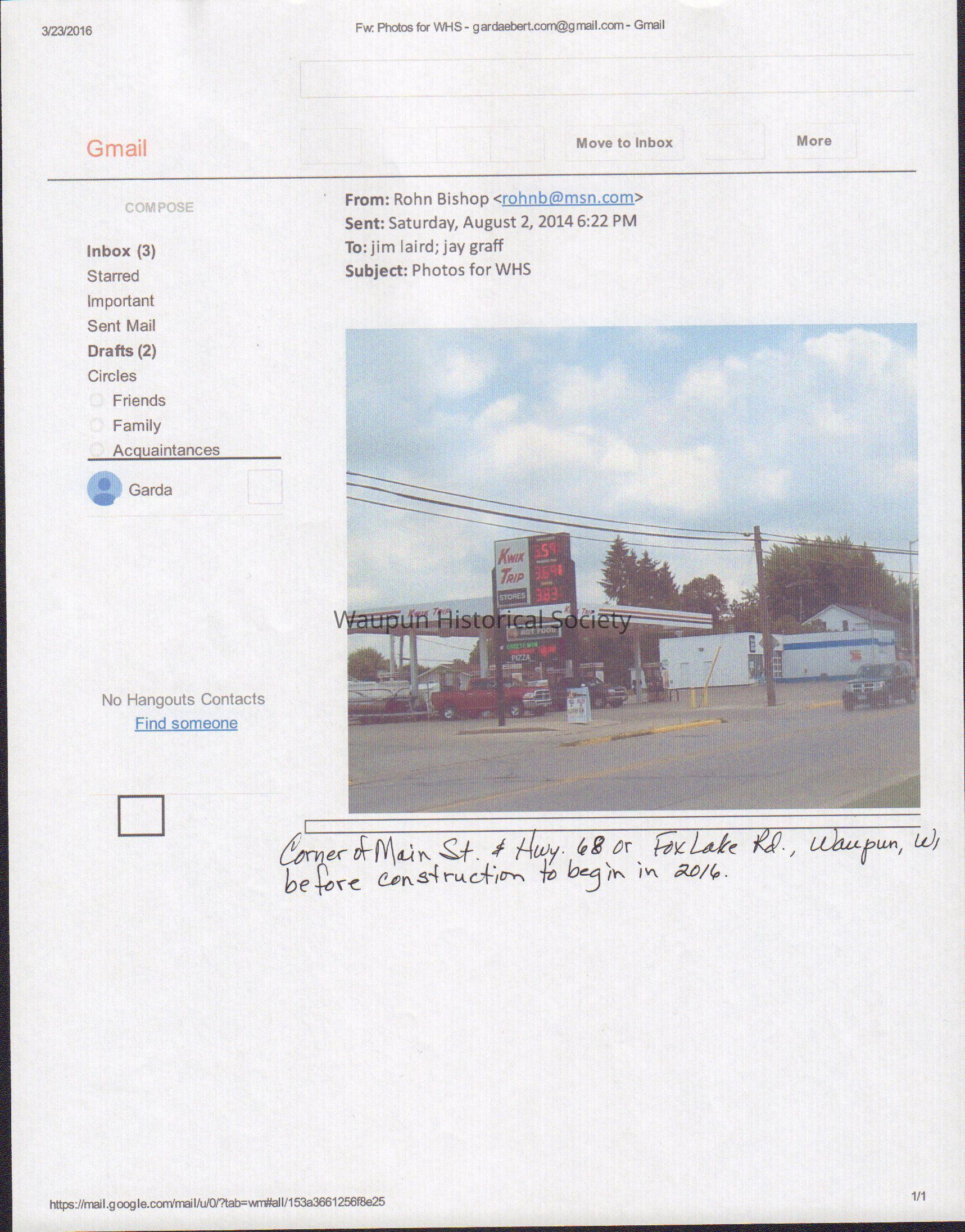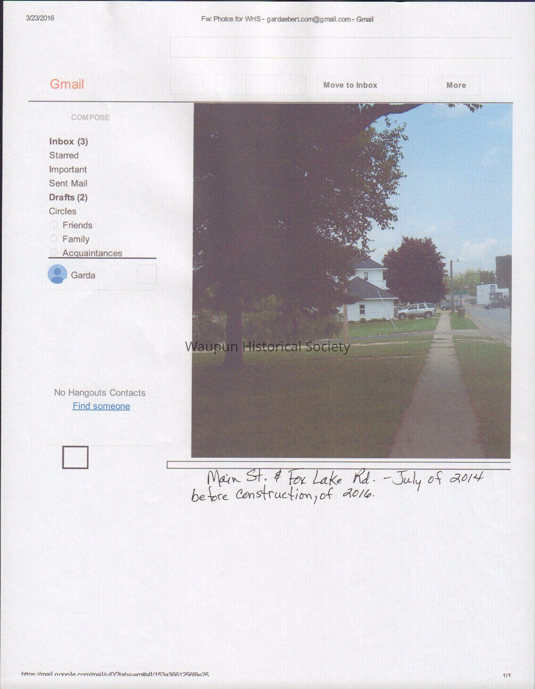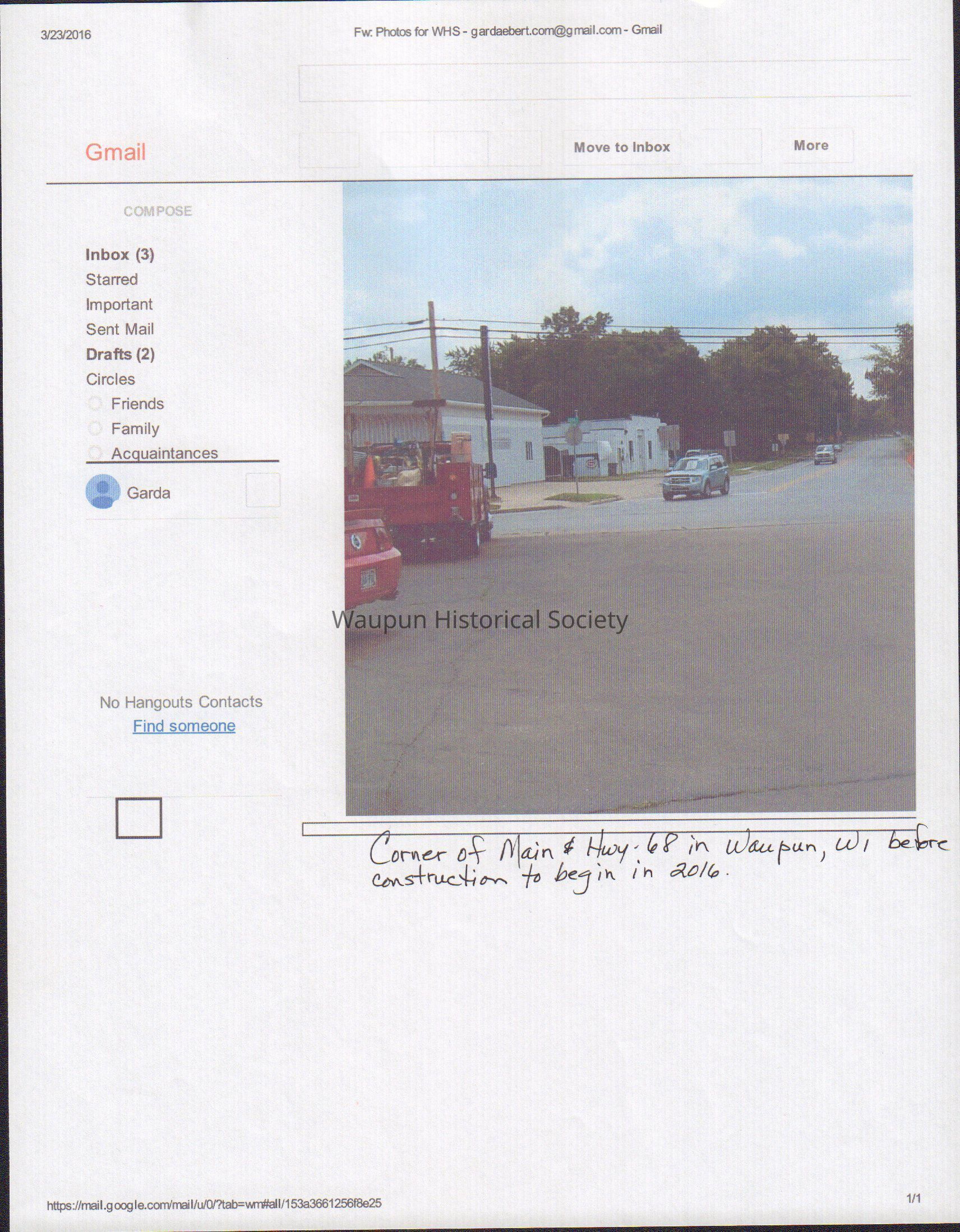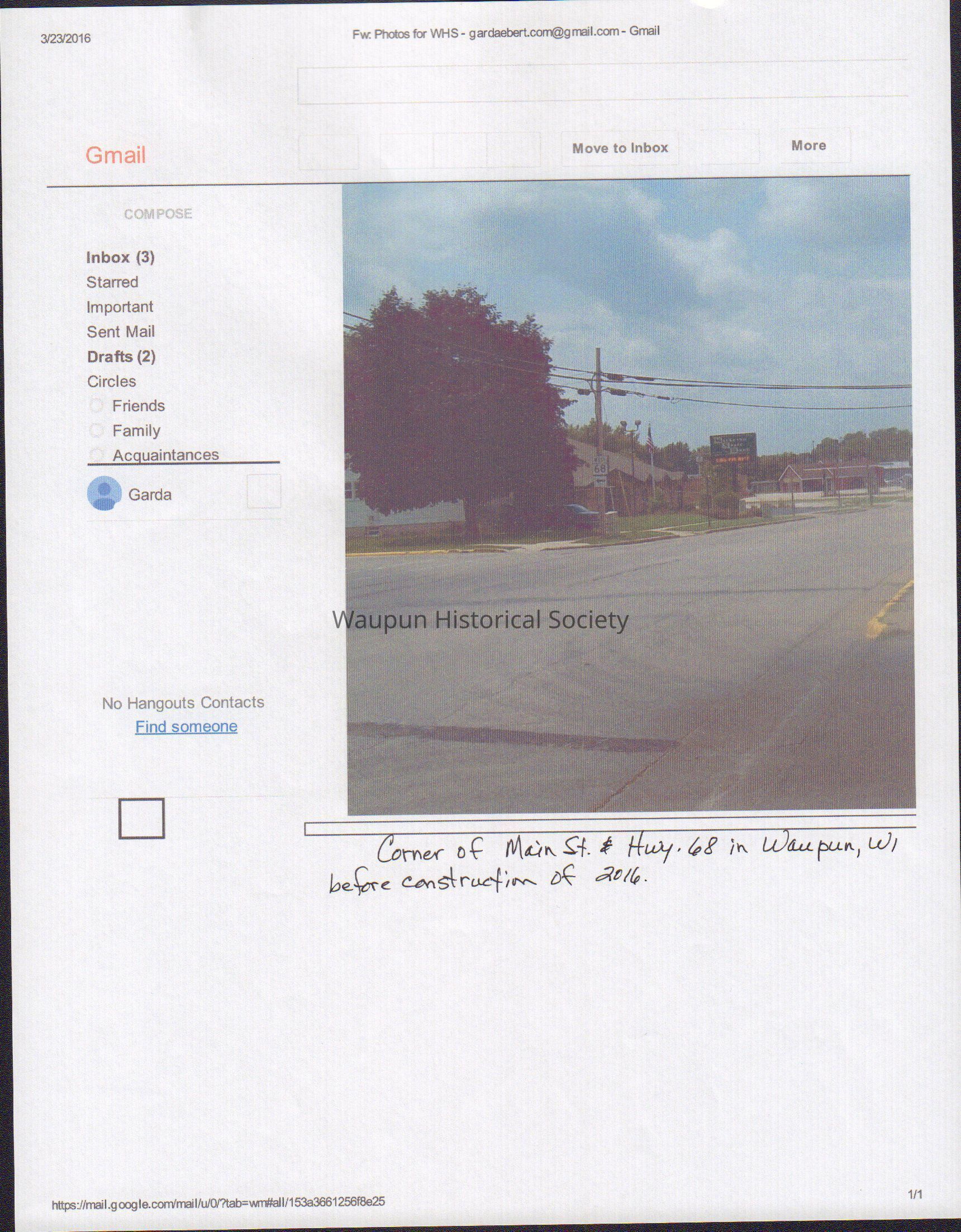 Computer copy of photo of Corner of Main St. & Hwy.68 or Fox Lake Road, Waupun, WI before construction begins in 2016.