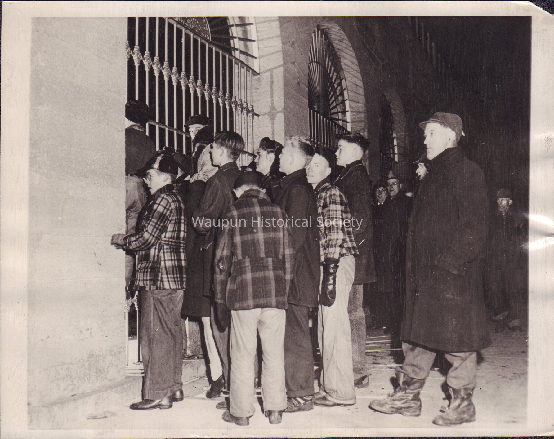 Photograph, Corrections, Wisconsin State Prison, Prison Disturbance, 1944. Black and white photo of a group of people gathered at the outside wall of the State Prison at Waupun, Wis. where sit-down strikes, burning of mattresses and sheets and threats of rioting caused inmates to be confined to their cells. Small groups of Waupun citizens lined the prison gates trying to get a glimpse of the activity within.