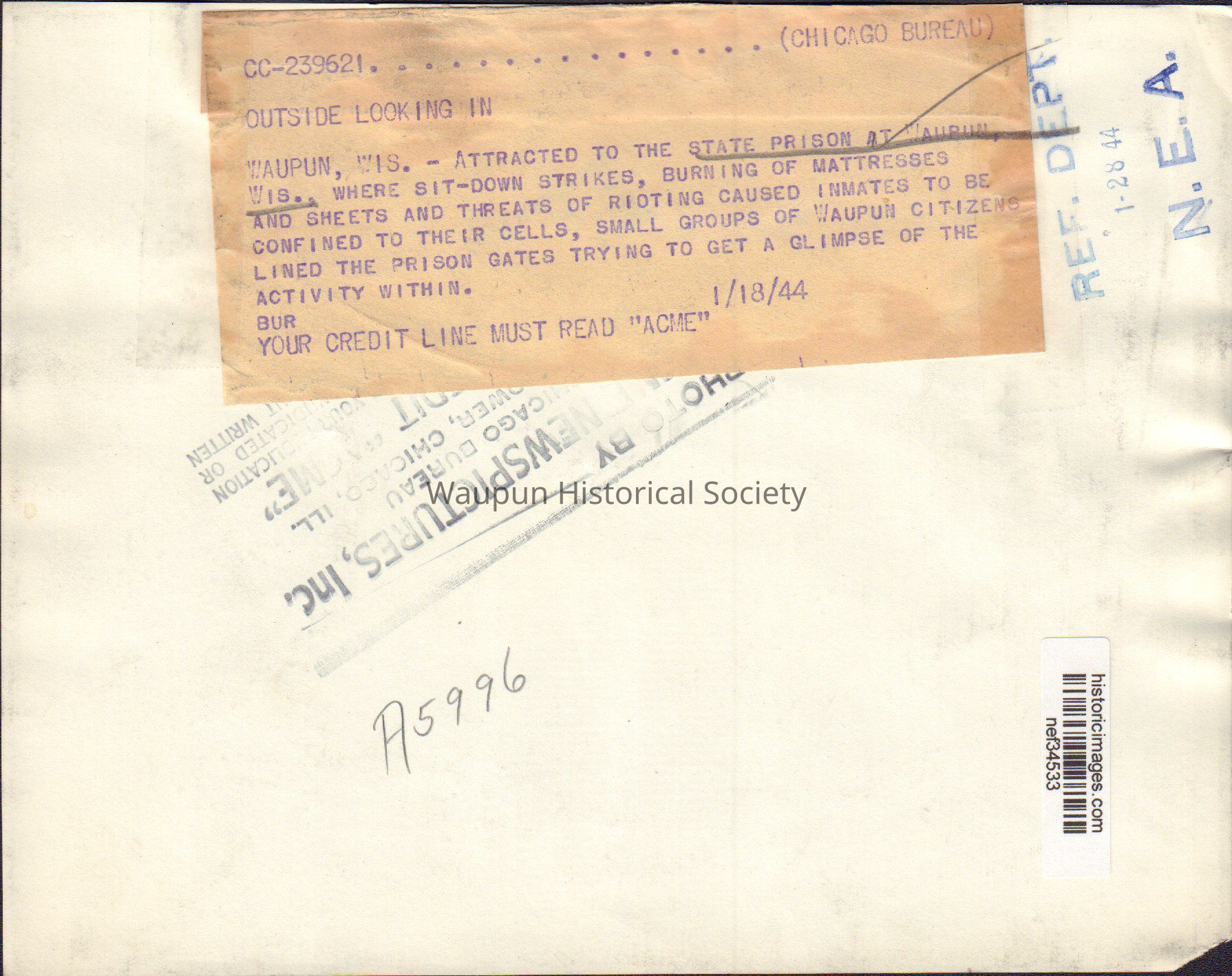 Photograph, Corrections, Wisconsin State Prison, Prison Disturbance, 1944Entry/Object ID
