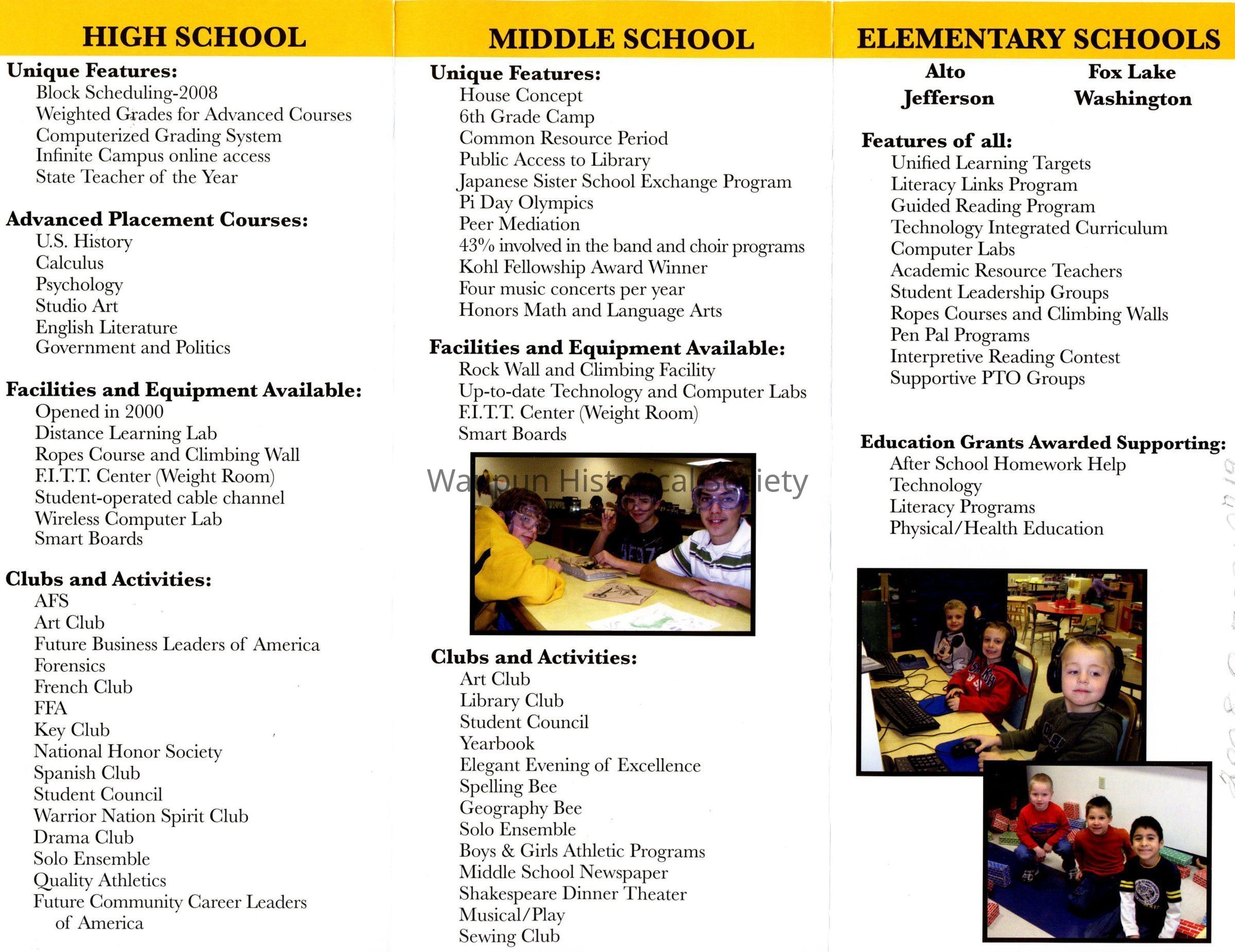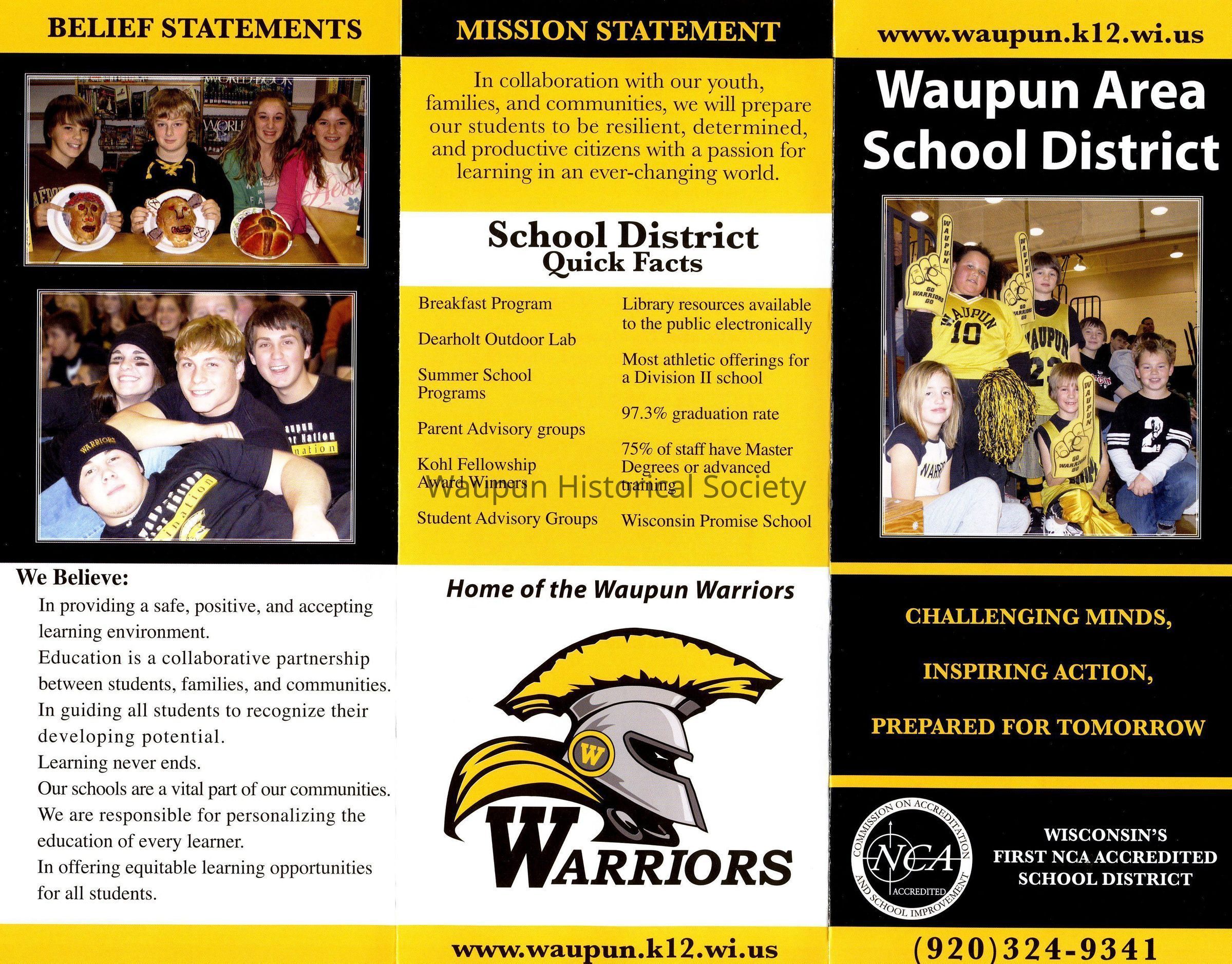 Waupun School District Brochure with the school mission statement, a listing of the beliefs, quick facts and extra offered by all three schools.Acquisition