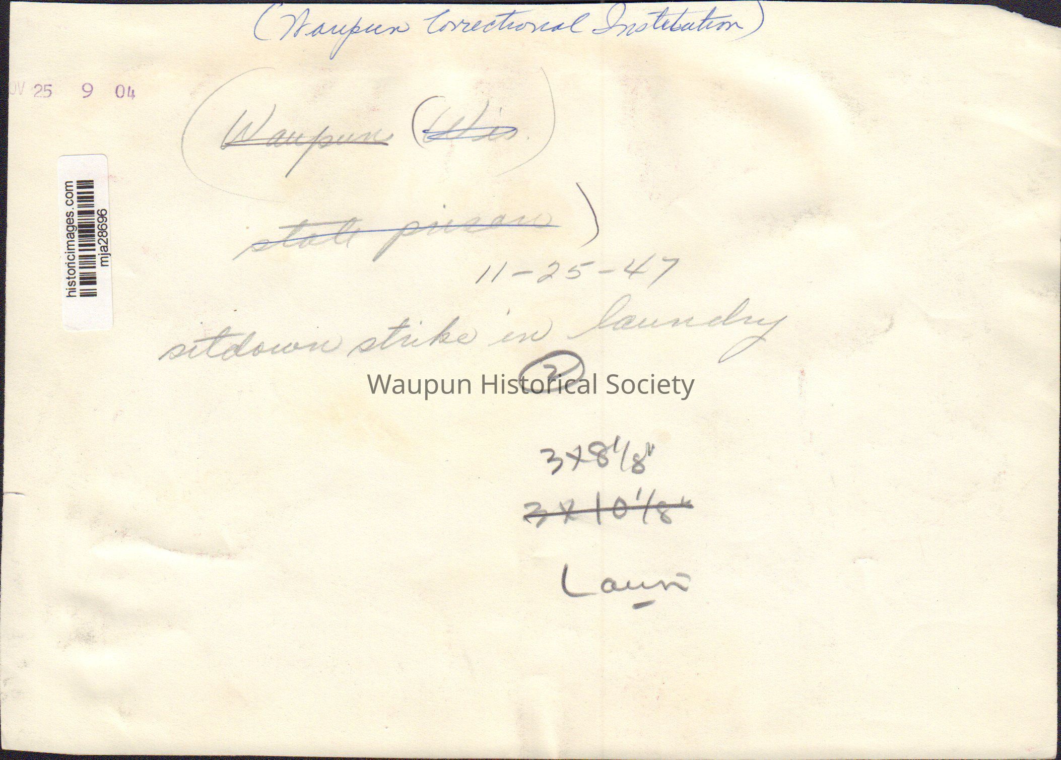 Photograph, Corrections, Wisconsin State Prison, Laundry Room. Black and white photo of laundry room in the Wisconsin State Prison, Waupun Correctional Institution, dated on back, 11-25-47 during the sitdown strike in laundry.