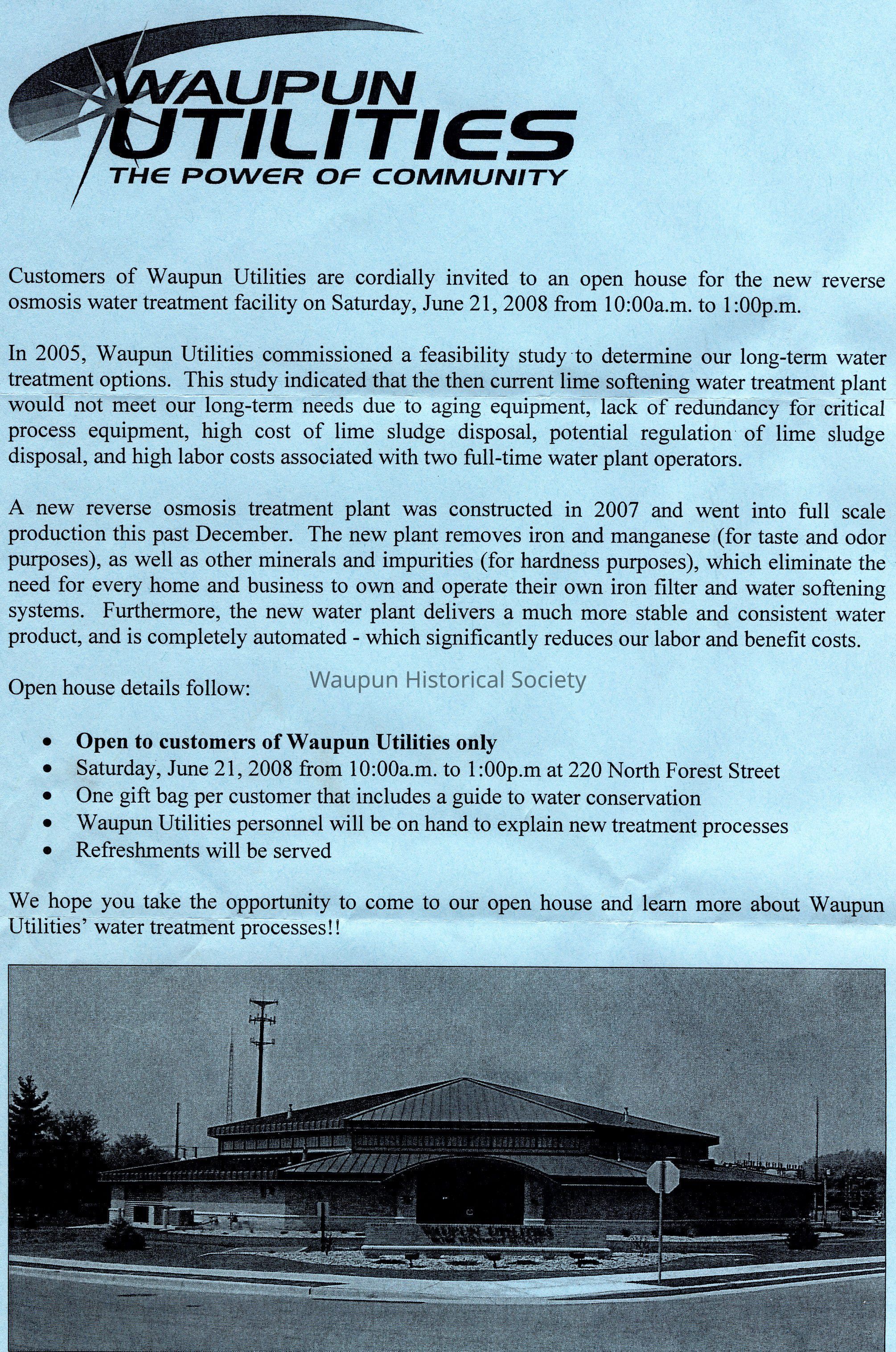 Customer Invitation to tour the new Waupun Utilities open house in 2008Acquisition