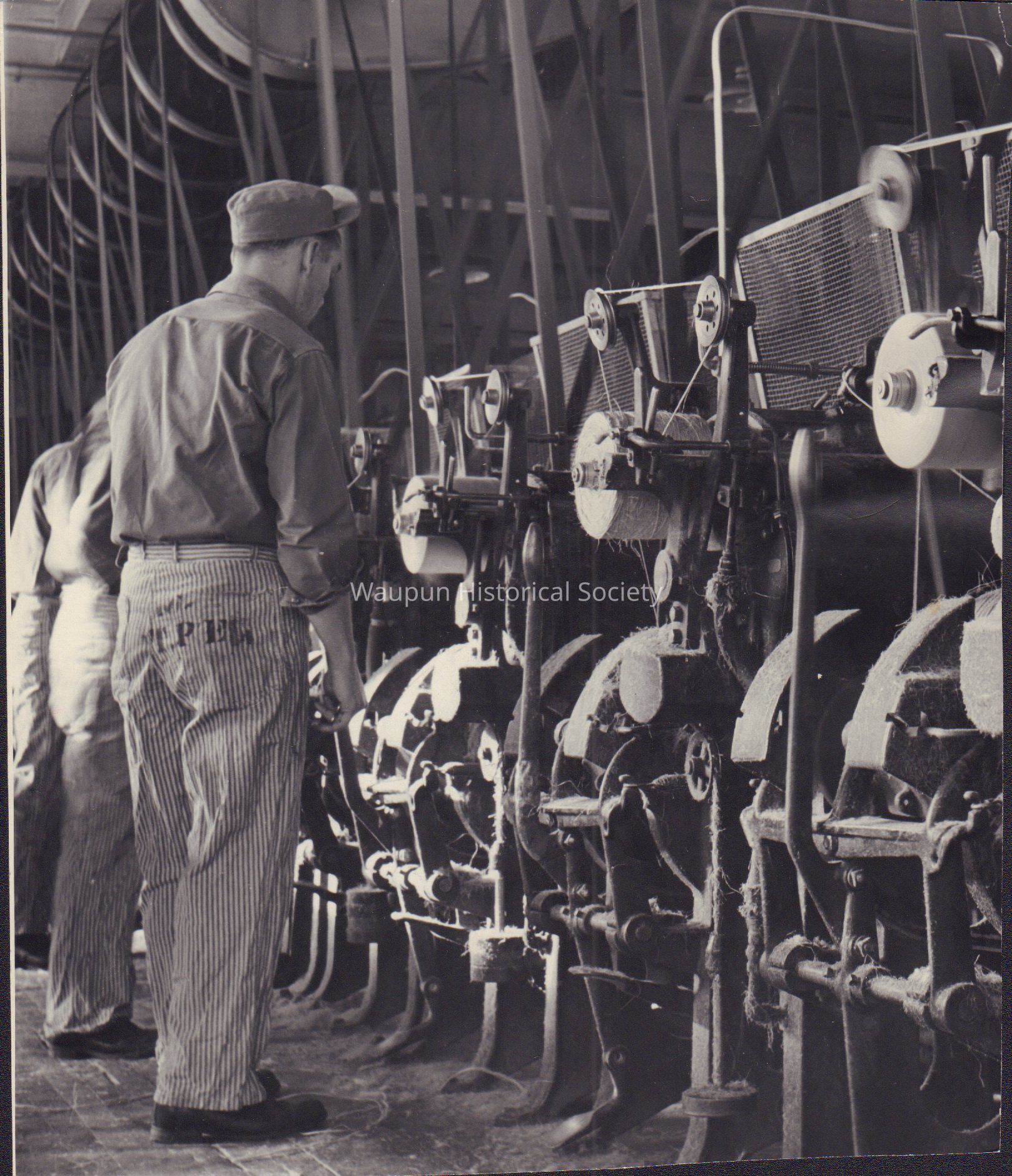 Photograph, Corrections, Wisconsin State Prison, Twine Plant. Black and white photo of prisoners of WI State Prison, Waupun, working in the twine plant in the WI State Prison. Prisoners who work in the roar of the twine plant put cotton in their ears to keep out the sound. That's twine on the spools