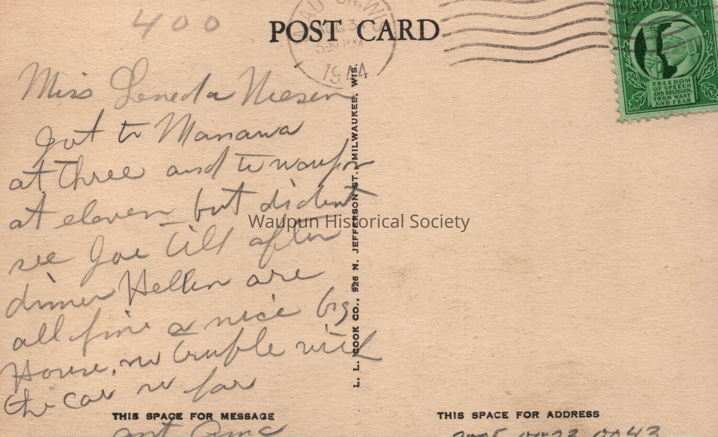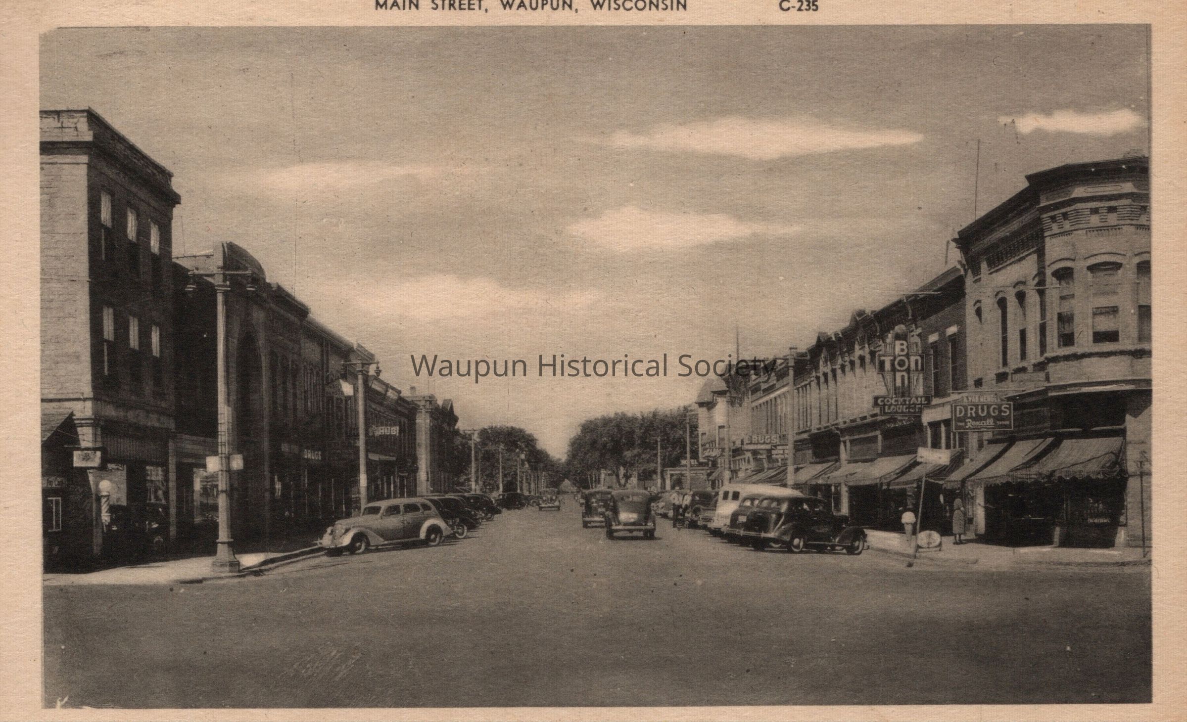 Postcard, Main St. Black & White postcard showing the 300 block of Waupun's main st. facing west.Acquisition