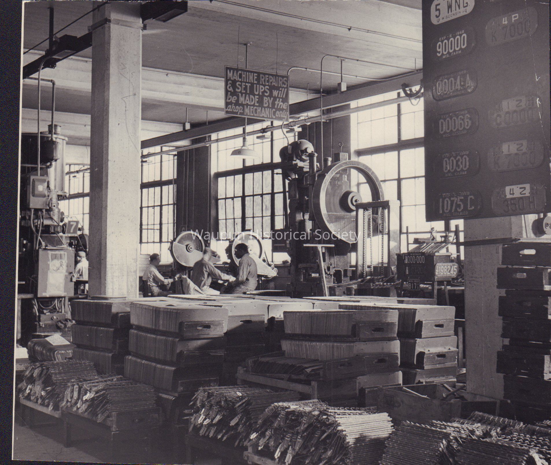 Photograph, Corrections, Wisconsin State Prison, Signs/License Plate Shop. Black and white photo of prisoners of WI State Prison, Waupun, working in the sign making shop.