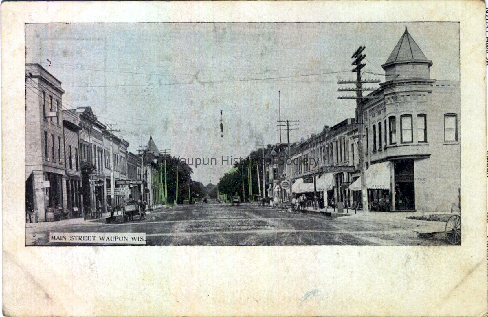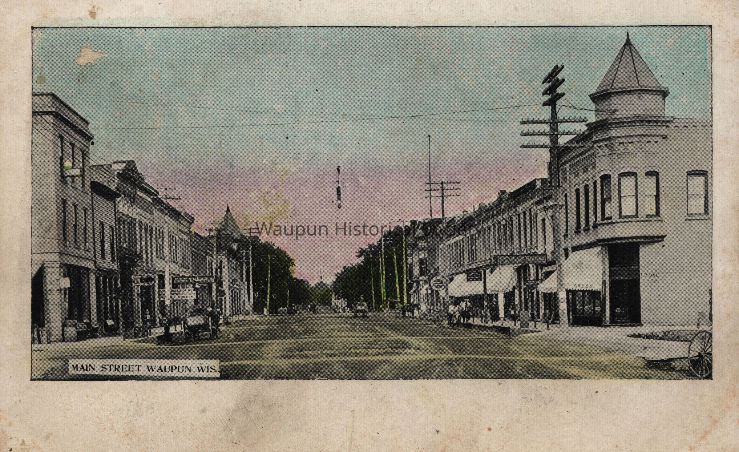 Postcard, Main St. Colorized postcard showing the 300 block of Waupun's main st. facing west.Acquisition