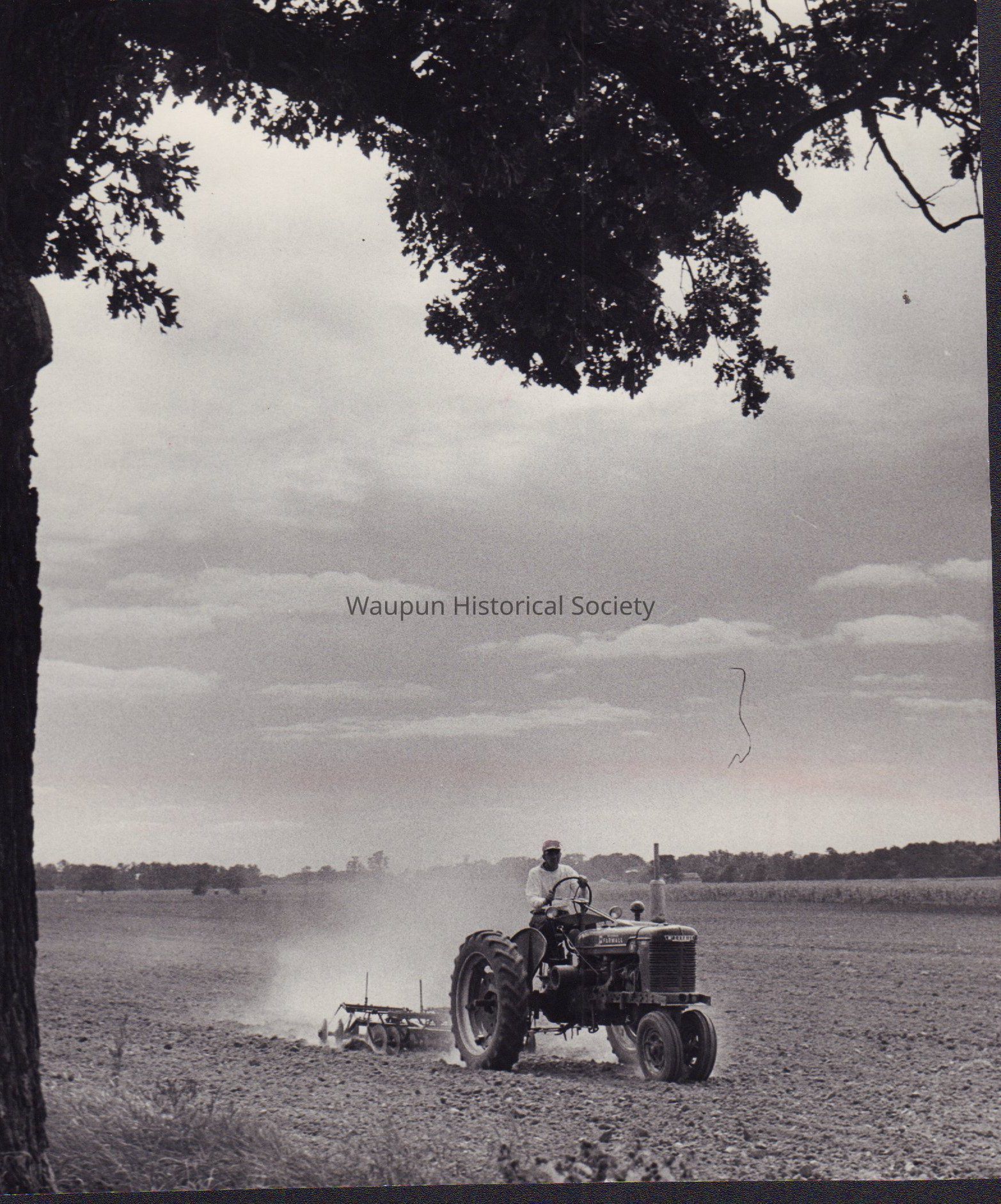 Photograph, Corrections, Wisconsin State Prison, Prison Farm. Black and white photo from Waupun Correctional Institution of Prison Farm where a prisoner is driving a Farmall tractor cutting furrows in field.