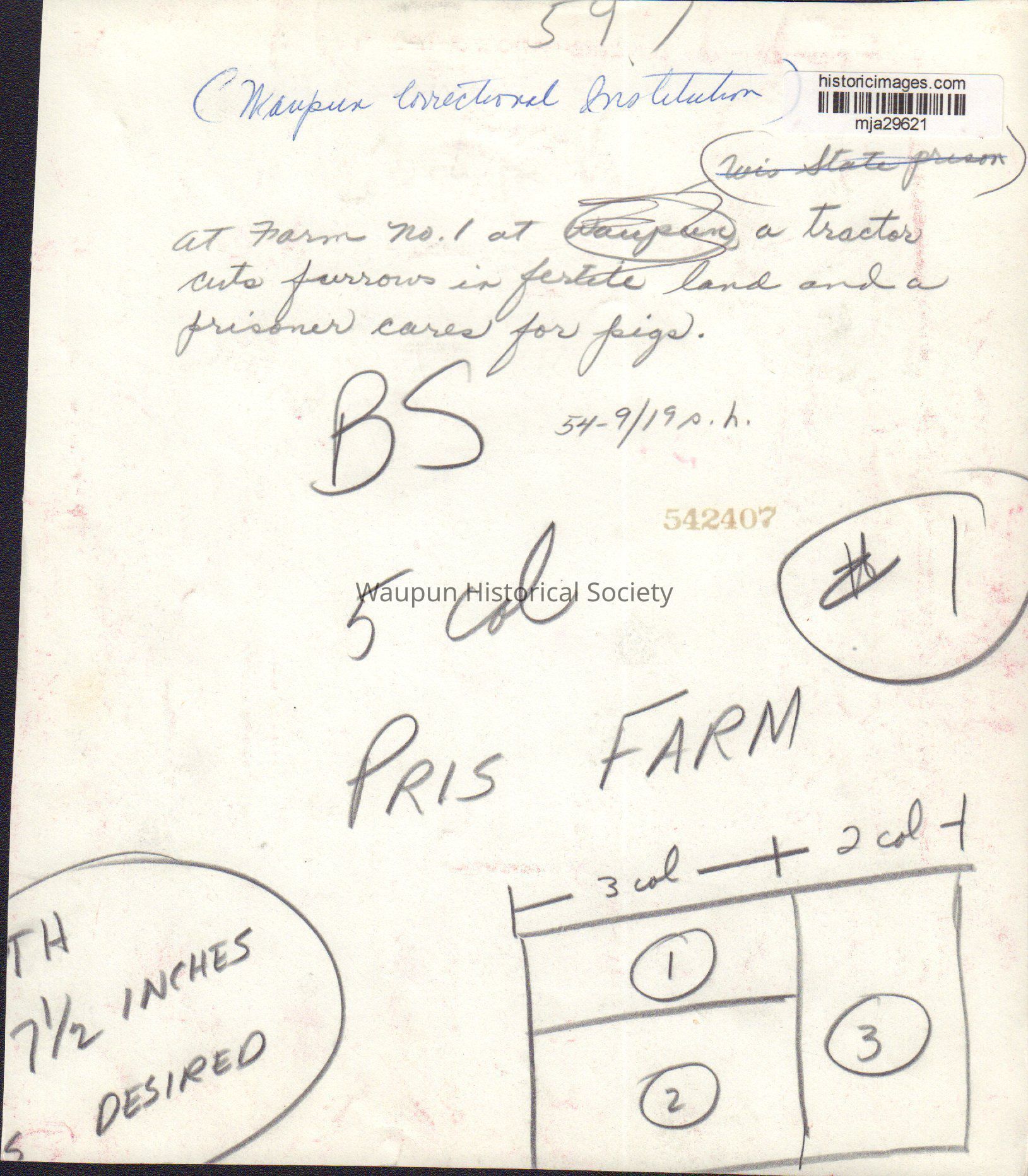 At Farm No. 1 at Waupun, a tractor cuts furrows in fertile land and a prisoner cares for pigs.Acquisition