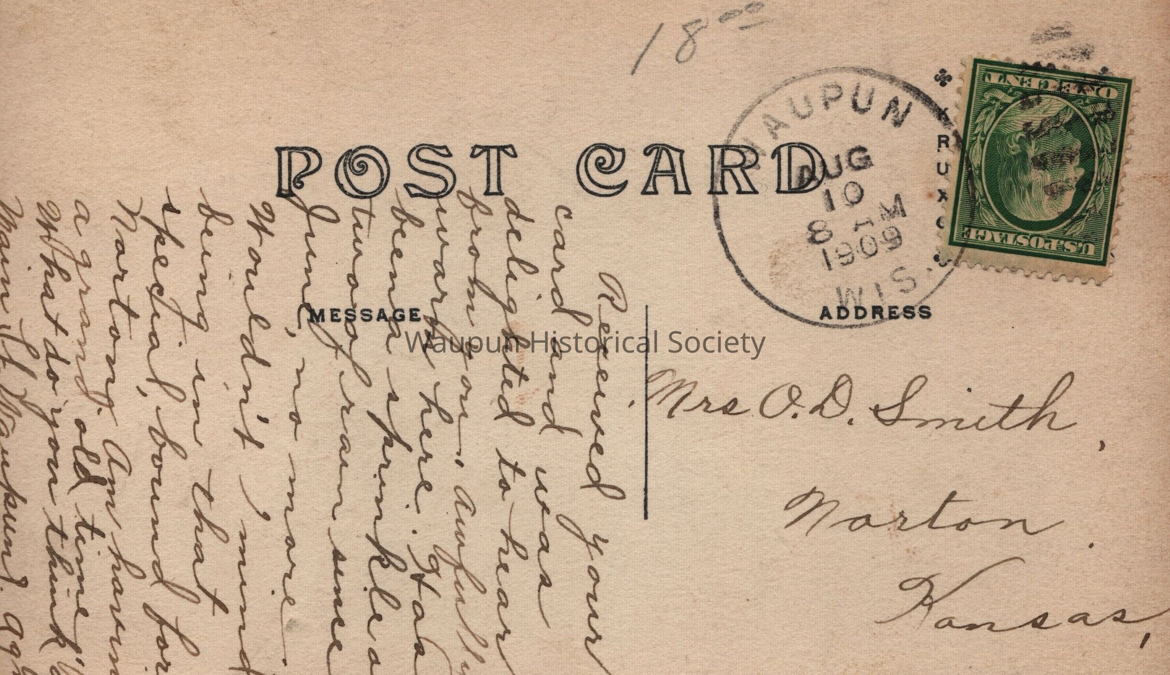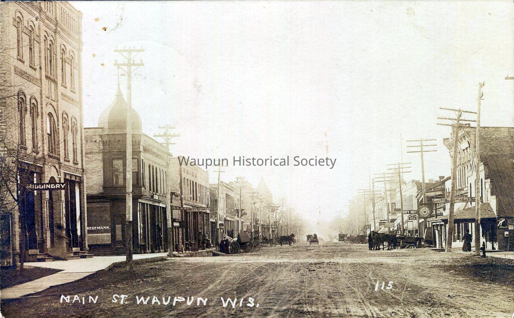 Postcard, Main St. Black & White postcard showing the north side of the 200 block of Waupun's main st. facing west. The millinery in the foreground "might have been" run by Kate P. Babcock on the corner of Washington (Main St.) and Carrington *see the 1858-59 Waupun DirectoryAcquisition