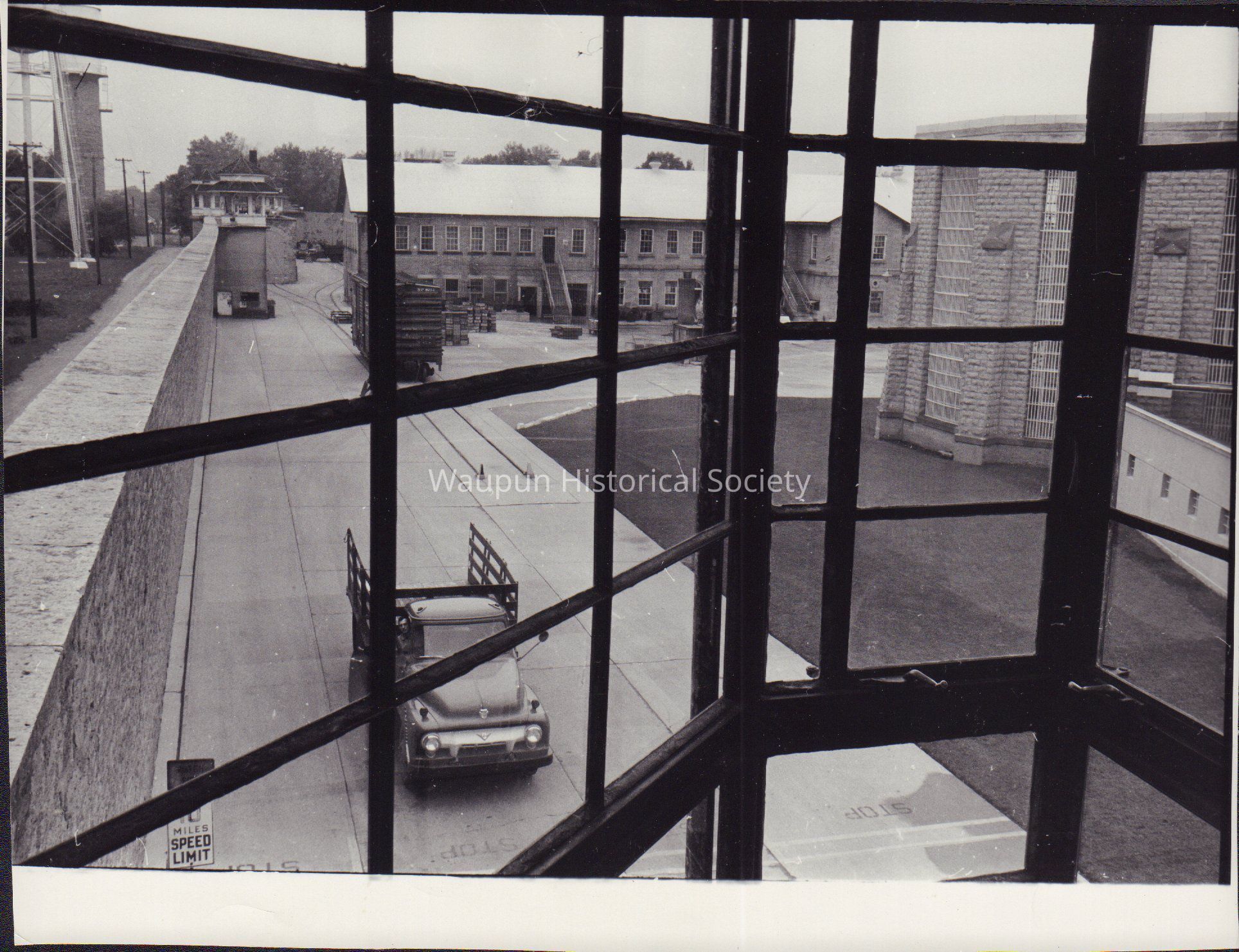 Inside one of the prison towers looking down on inside working area of Waupun state prison of 1959. Notice the train car.Acquisition