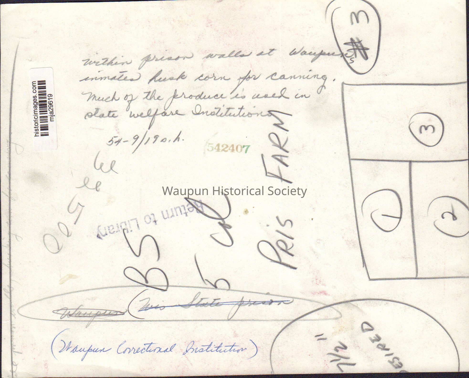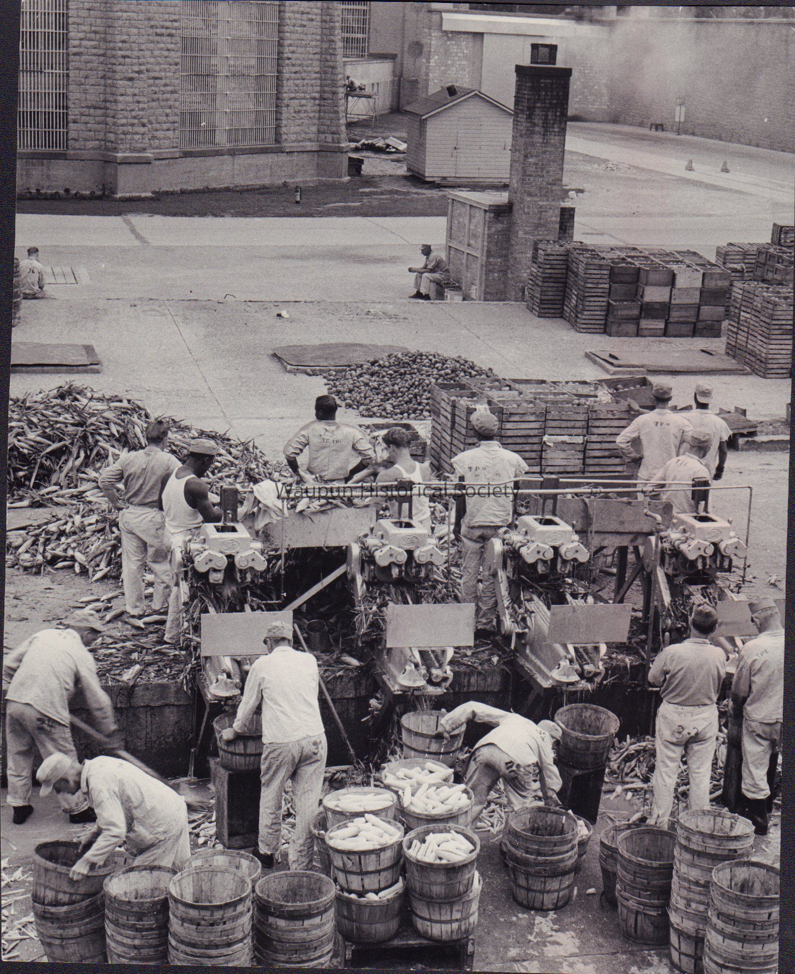 Within prison walls at Waupun, inmates husk corn for canning. Much of the produce is used in state Welfare Institution. Date stamped on back is Septermber 19, 1954.Acquisition