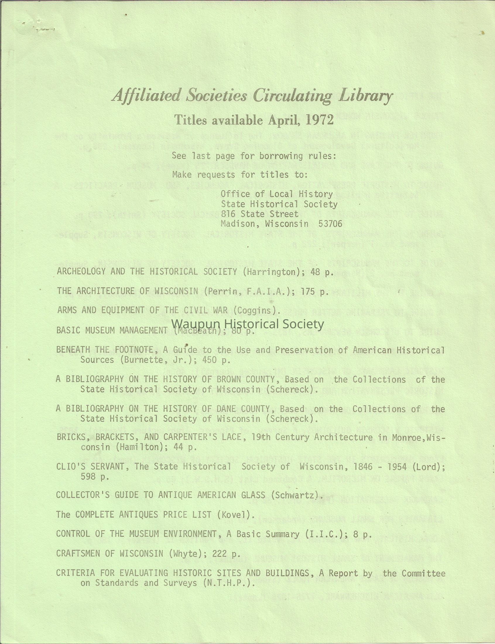 A Guide to circulating the Library and the affiliated Societies and the rules of lending and borrowing from the History State Historical SocietyAcquisition