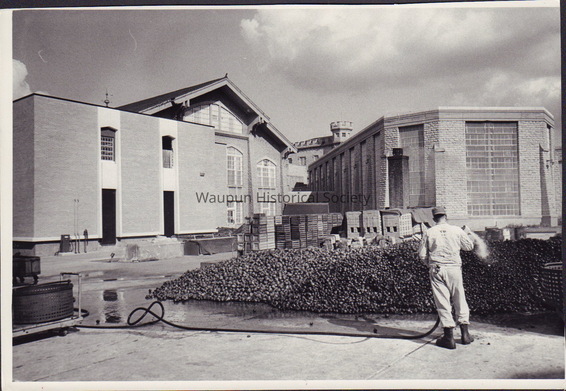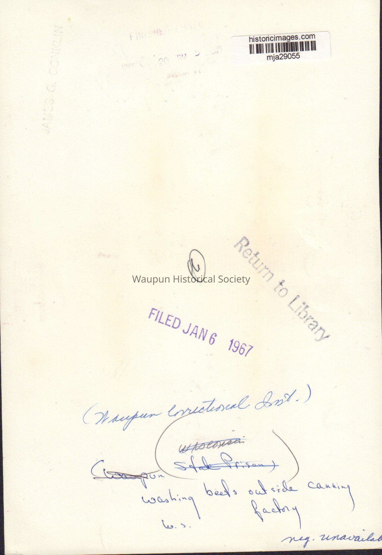 Photograph, Corrections, Wisconsin State Prison, Beets for Canning. Black and white photo from Waupun Correctional Institution of an inmate washing beets outside canning factory portion of prison. Photo dated Jan. 6, 1967.Acquisition