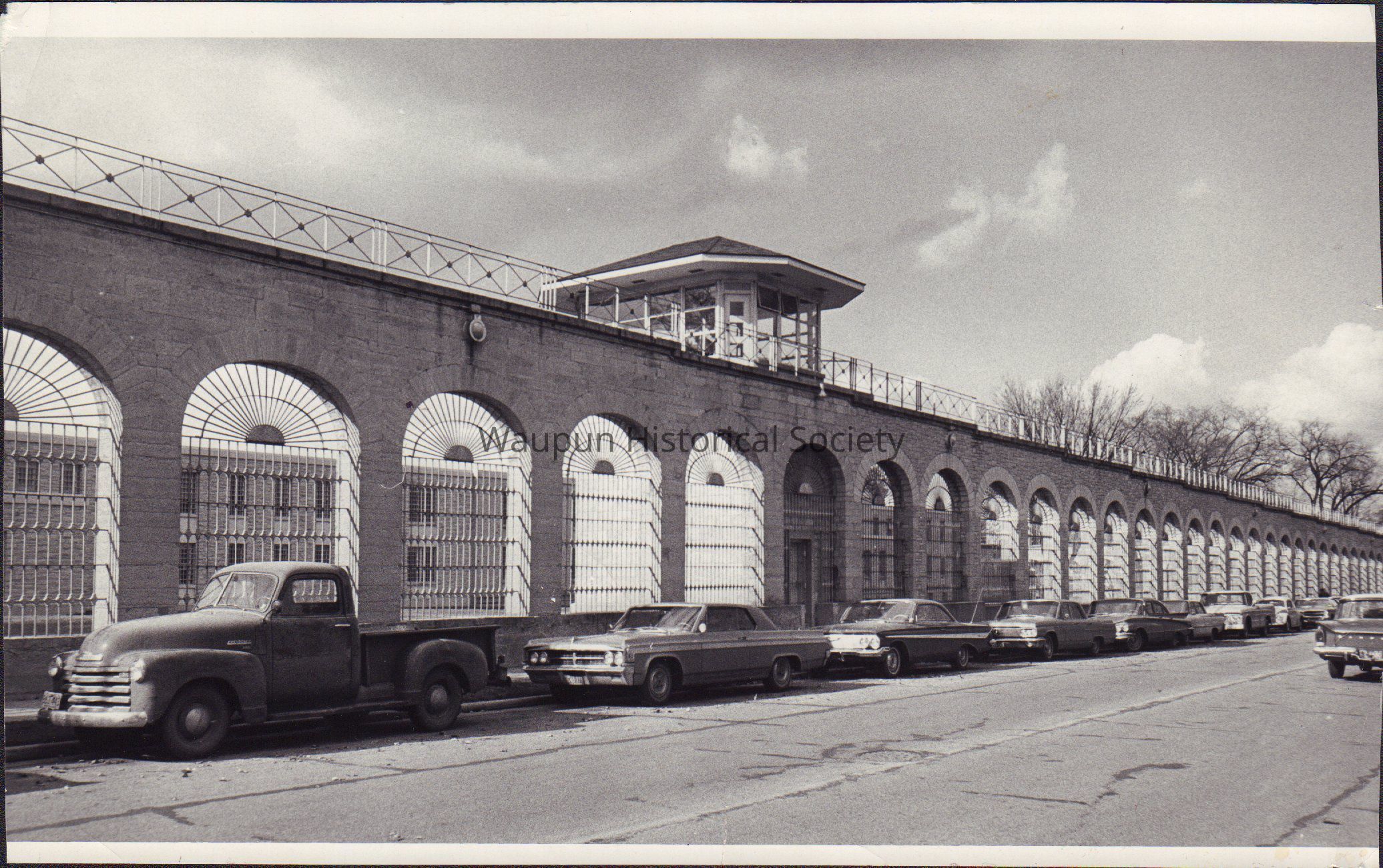 Photograph, Corrections, Wisconsin State Prison, Front Wall. Black and white photo from Waupun Correctional Institution of prison wall. Check out the "old" vehicles parked along the front. Good view of one of the towers atop the prison wall.Acquisition