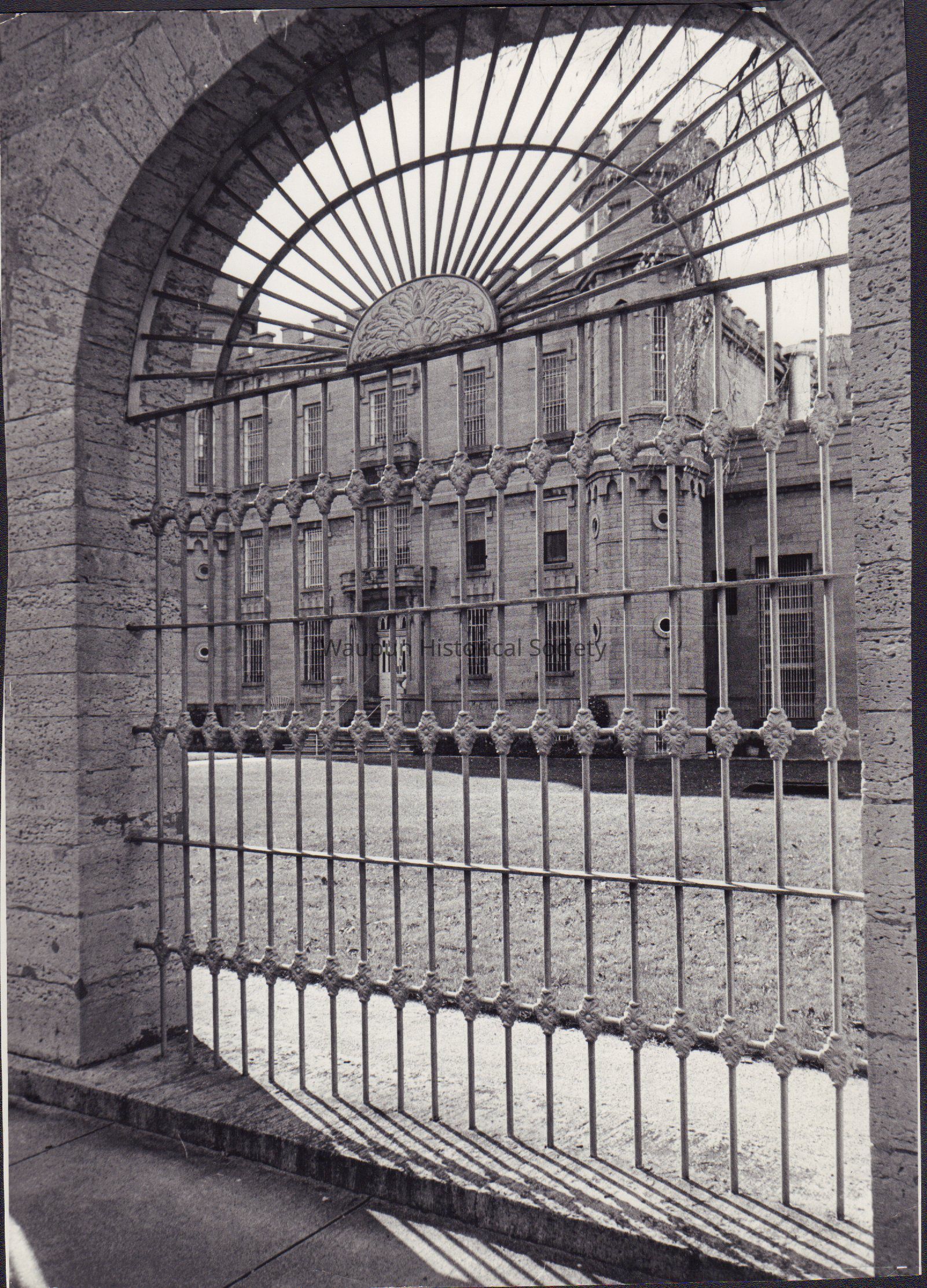 Photograph, Corrections, Wisconsin State Prison, Prison Wall Bars. Black and white photo from Waupun Correctional Institution of close up view of bars in section of prison wall with a view of the front entrance to the prison.Acquisition