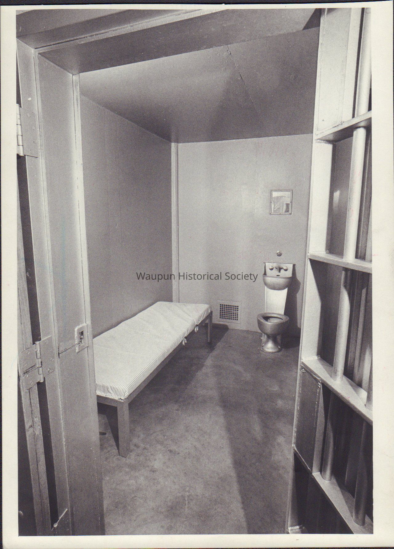 Photograph, Corrections, Wisconsin State Prison, Solitary Confinement Cell. Black and white photo from Waupun Correctional Institution of one of Waupun Prison's solitary confinement cells.