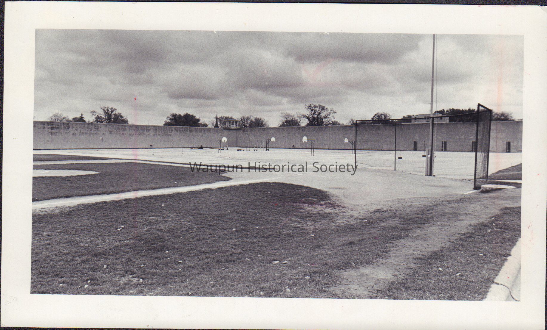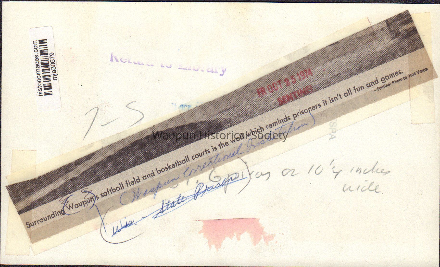 Photograph, Corrections, Wisconsin State Prison, Baseball & Basketball. Black and white photo from Waupun Correctional Institution of prison softball field and basketball courts. As stated in newspaper article, surrounding the courts is the wall which reminds prisoners it isn't all fun and games.