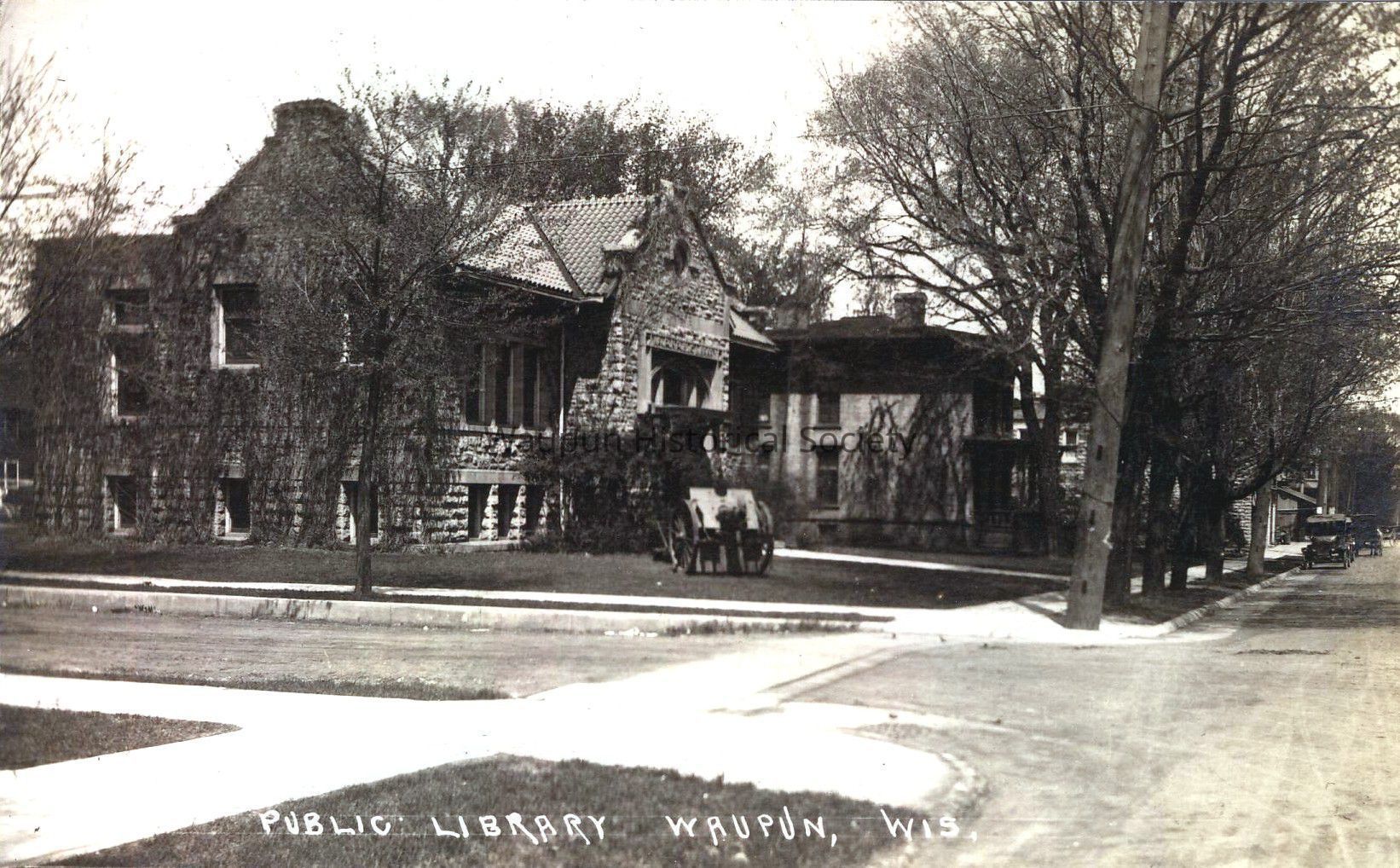 Postcard, Library, Museum, Carnegie. Postcard of the "Waupun Public Library." This is a Carnegie building. Andrew Carnegie (1835 - 1919) gave the money to build the building. The cornerstone is dated 1904.Acquisition