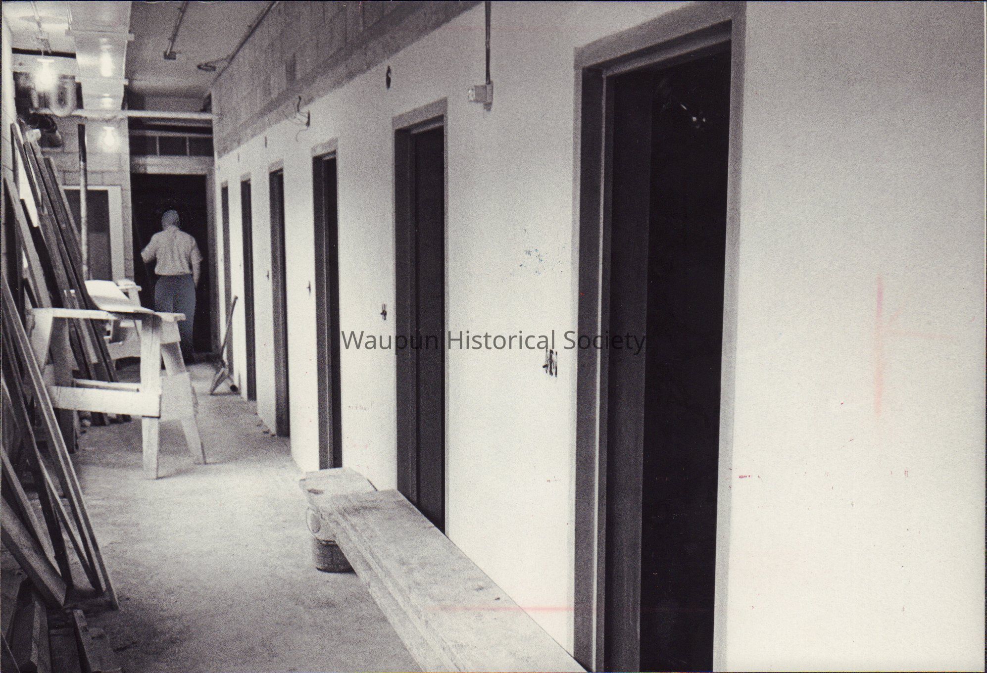 Below: The doors to the eight new cells beneath the Segregation Building at Waupun are not yet in place, but the interiors of the sound-proofed cells are about complete. Light switches for each isolation cell are outside the door. The shower room is at left, behind the leaning boards.Acquisition