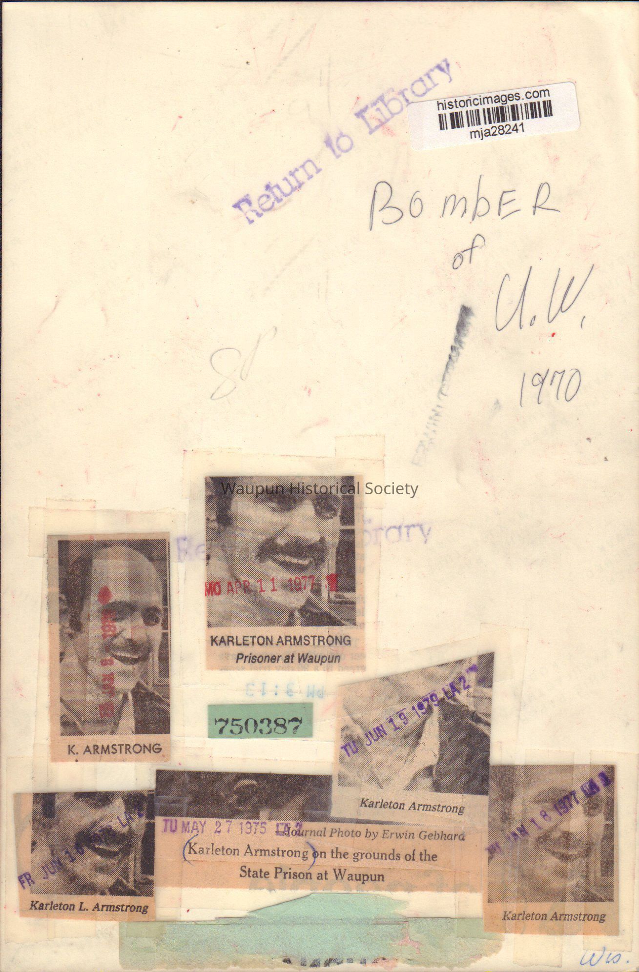 There are 6 newspaper photos of Karleton Armstrong at Waupun State Prison. This photo is of him of TU May 27, 1975. Others photos are from Jan. 9, 1975, Jan. 18, 1977, Apr. 11, 1977, June 16, 1978 and June 19, 1979.