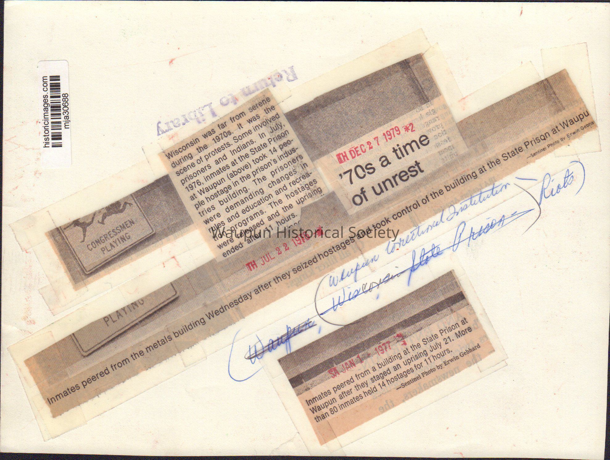 Newspaper clippings from Sentinel Photo by Erwin Gebhard dated Jan 1, 1977 and July 22, 1976; also newspaper clipping dated Dec. 27, 1979. All are regarding inmate uprising at Waupun State Prison of July 21, 1976.