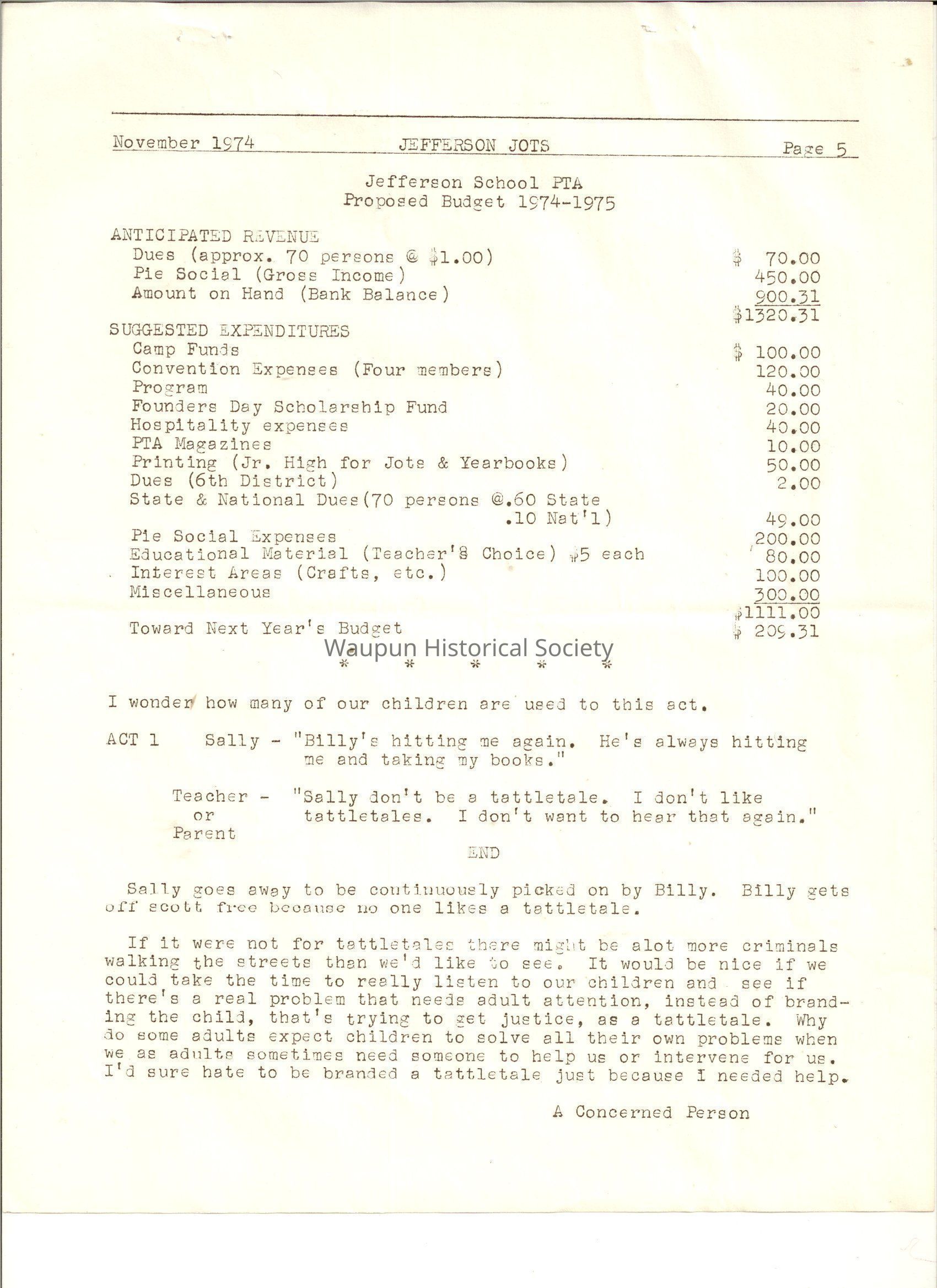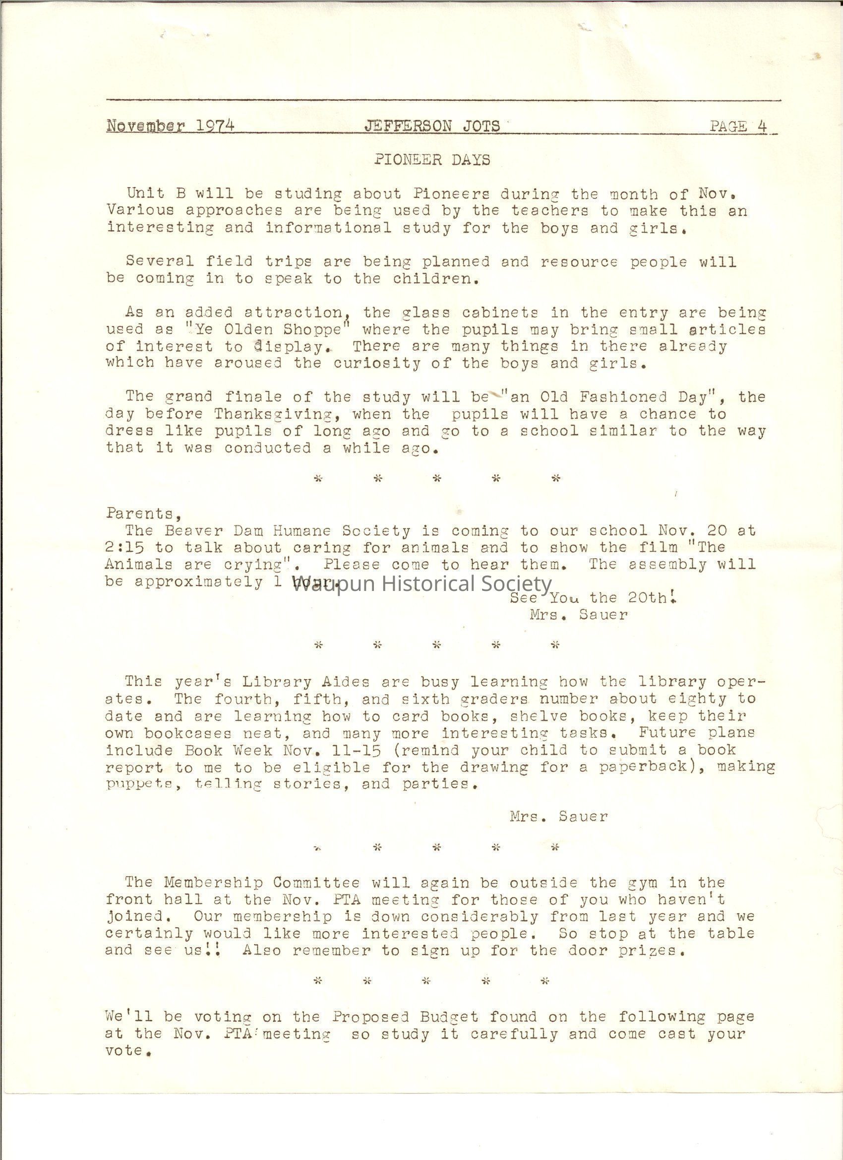 JEFFERSON JOTS is to inform parents about national School lunch week and the school Picture and dates to remember and the memorie of James Korte and the next P. T. A. meeting and pioneer days and the grand finale is study of "Old Fashioned Days".Acquisition